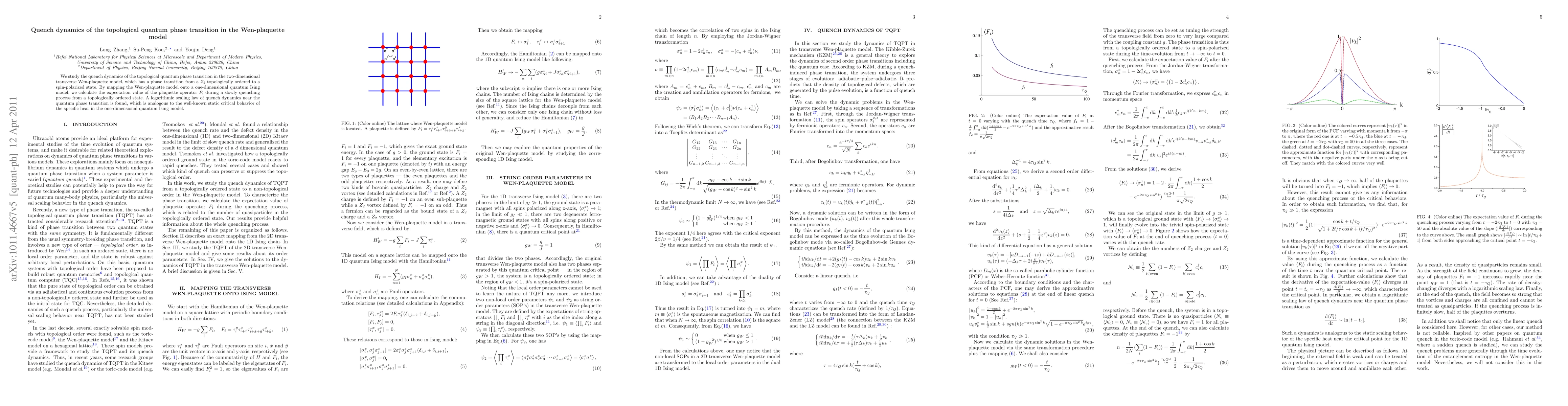 This paper investigates the quench dynamics during a topological quantum phase transition in the Wen-plaquette model, mapping it onto a one-dimensional quantum Ising model. The study reveals a logarithmic scaling law in the expectation value of the plaquette operator during a slow quench, mirroring the static critical behavior of the specific heat in the Ising model.