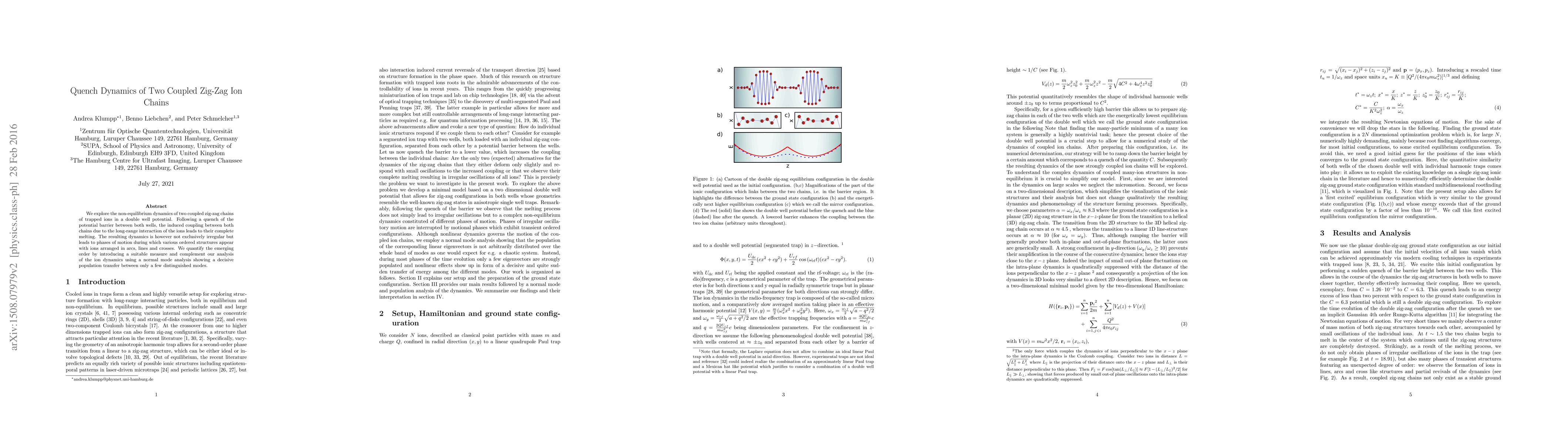 Two coupled ionic zig-zag chains of trapped ions exhibit melting dynamics after a potential barrier quench, forming ordered structures like arcs, lines, and crosses. A normal mode analysis reveals population transfer between specific modes, indicating the emergence of order in the system.