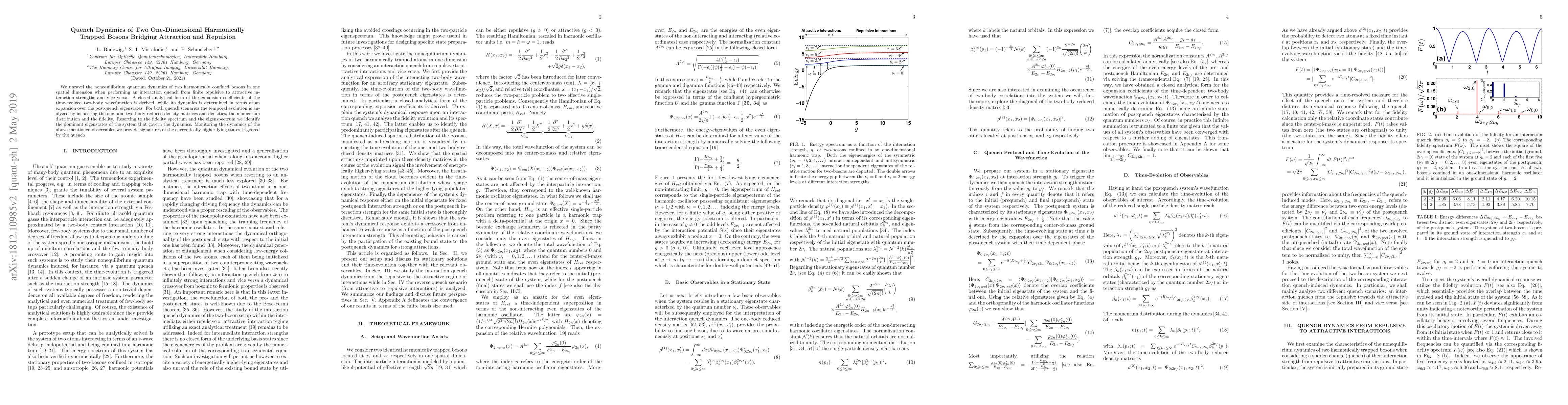 Researchers studied the quantum dynamics of two bosons in a one-dimensional trap after suddenly changing their interaction strength from repulsive to attractive or vice versa. They found that the system's evolution is governed by dominant eigenstates triggered by the quench.