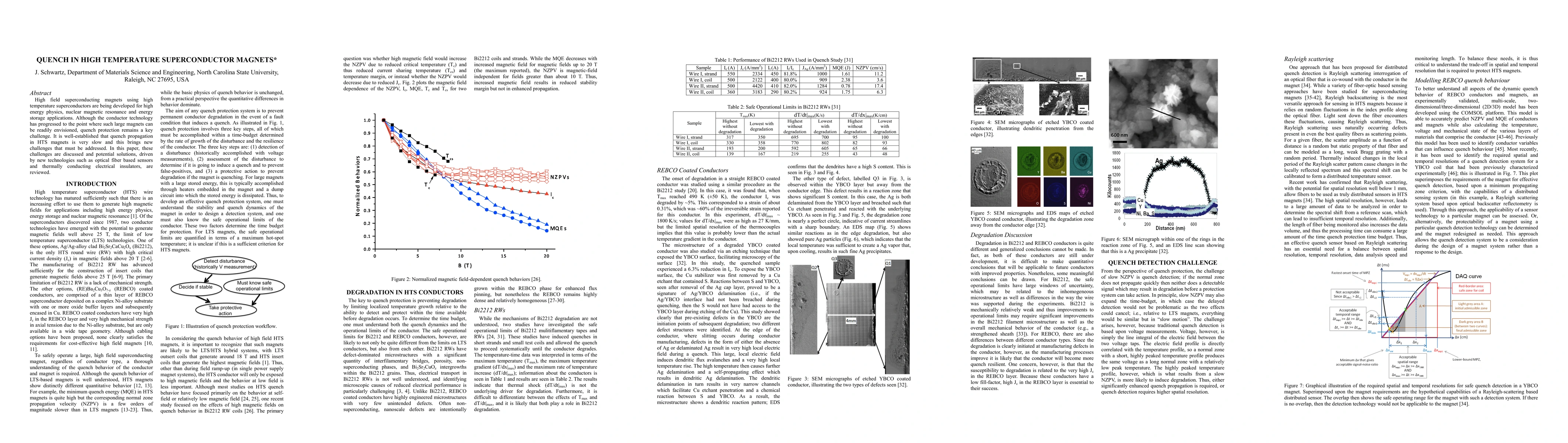 This paper discusses the challenges of quench protection in high field superconducting magnets using high temperature superconductors, emphasizing the slow propagation of quenches and reviewing potential solutions, including advanced optical fiber sensors and thermally conducting electrical insulators.