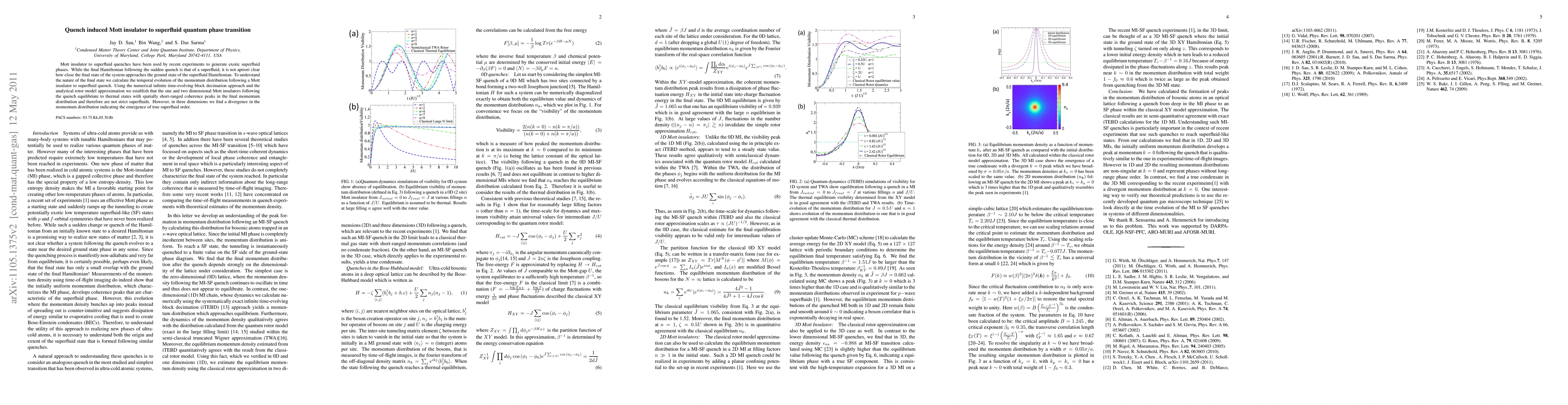Mott insulator to superfluid quenches have been used by recent experiments to generate exotic superfluid phases. While the final Hamiltonian following the sudden quench is that of a superfluid, it is not a priori clear how close the final state of the system approaches the ground state of the superfluid Hamiltonian. To understand the nature of the final state we calculate the temporal evolution of the momentum distribution following a Mott insulator to superfluid quench. Using the numerical infinite time-evolving block decimation approach and the analytical rotor model approximation we establish that the one and two dimensional Mott insulators following the quench equilibriate to thermal states with spatially short-ranged coherence peaks in the final momentum distribution and therefore are not strict superfluids. However, in three dimensions we find a divergence in the momentum distribution indicating the emergence of true superfluid order.