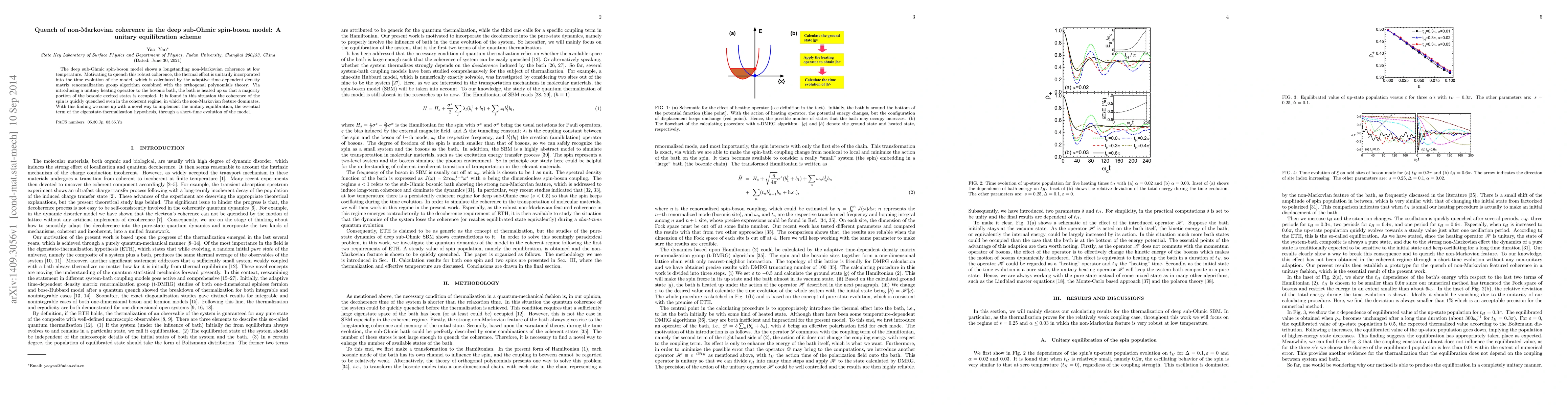The deep sub-Ohmic spin-boson model shows a longstanding non-Markovian coherence at low temperature. Motivating to quench this robust coherence, the thermal effect is unitarily incorporated into the time evolution of the model, which is calculated by the adaptive time-dependent density matrix renormalization group algorithm combined with the orthogonal polynomials theory. Via introducing a unitary heating operator to the bosonic bath, the bath is heated up so that a majority portion of the bosonic excited states is occupied. It is found in this situation the coherence of the spin is quickly quenched even in the coherent regime, in which the non-Markovian feature dominates. With this finding we come up with a novel way to implement the unitary equilibration, the essential term of the eigenstate-thermalization hypothesis, through a short-time evolution of the model.