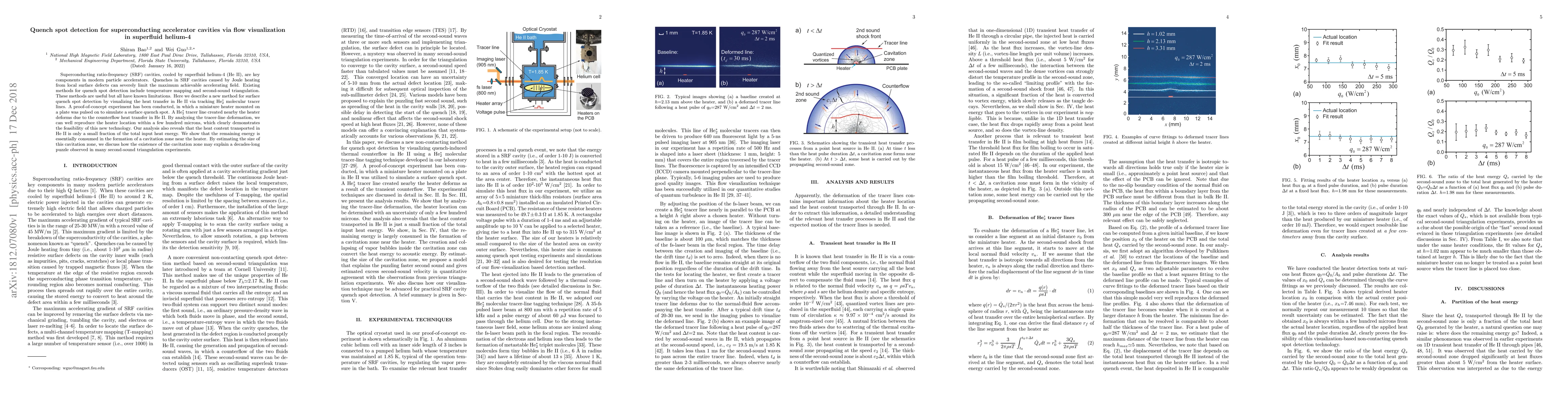 Superconducting ratio-frequency (SRF) cavities, cooled by superfluid helium-4 (He II), are key components in modern particle accelerators. Quenches in SRF cavities caused by Joule heating from local surface defects can severely limit the maximum achievable accelerating field. Existing methods for quench spot detection include temperature mapping and second-sound triangulation. These methods are useful but all have known limitations. Here we describe a new method for surface quench spot detection by visualizing the heat transfer in He II via tracking He$_2^*$ molecular tracer lines. A proof-of-concept experiment has been conducted, in which a miniature heater mounted on a plate was pulsed on to simulate a surface quench spot. A He$_2^*$ tracer line created nearby the heater deforms due to the counterflow heat transfer in He II. By analyzing the tracer-line deformation, we can well reproduce the heater location within a few hundred microns, which clearly demonstrates the feasibility of this new technology. Our analysis also reveals that the heat content transported in He II is only a small fraction of the total input heat energy. We show that the remaining energy is essentially consumed in the formation of a cavitation zone near the heater. By estimating the size of this cavitation zone, we discuss how the existence of the cavitation zone may explain a decades-long puzzle observed in many second-sound triangulation experiments.