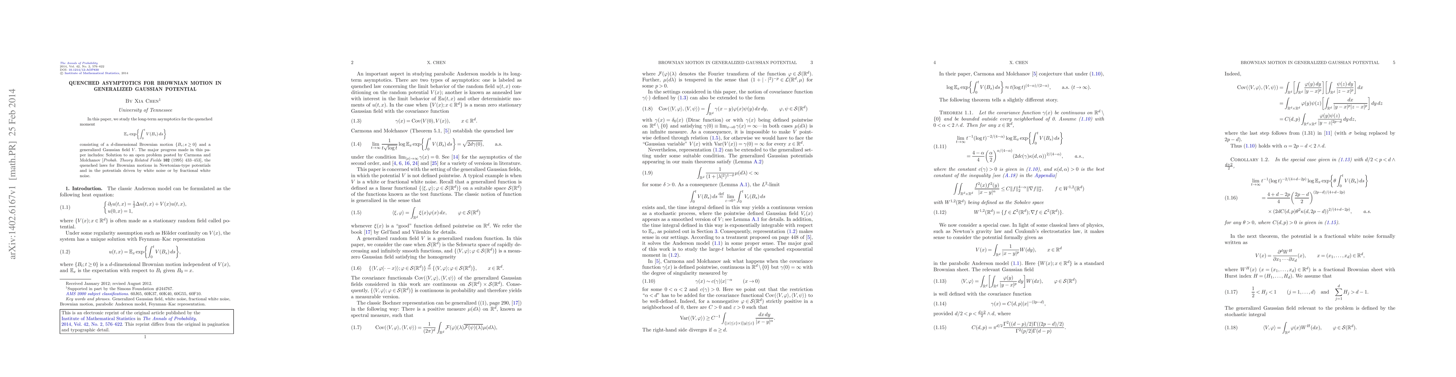 In this paper, we study the long-term asymptotics for the quenched moment \[\mathbb{E}_x\exp \biggl\{\int_0^tV(B_s)\,ds\biggr\}\] consisting of a $d$-dimensional Brownian motion $\{B_s;s\ge 0\}$ and a generalized Gaussian field $V$. The major progress made in this paper includes: Solution to an open problem posted by Carmona and Molchanov [Probab. Theory Related Fields 102 (1995) 433-453], the quenched laws for Brownian motions in Newtonian-type potentials and in the potentials driven by white noise or by fractional white noise.