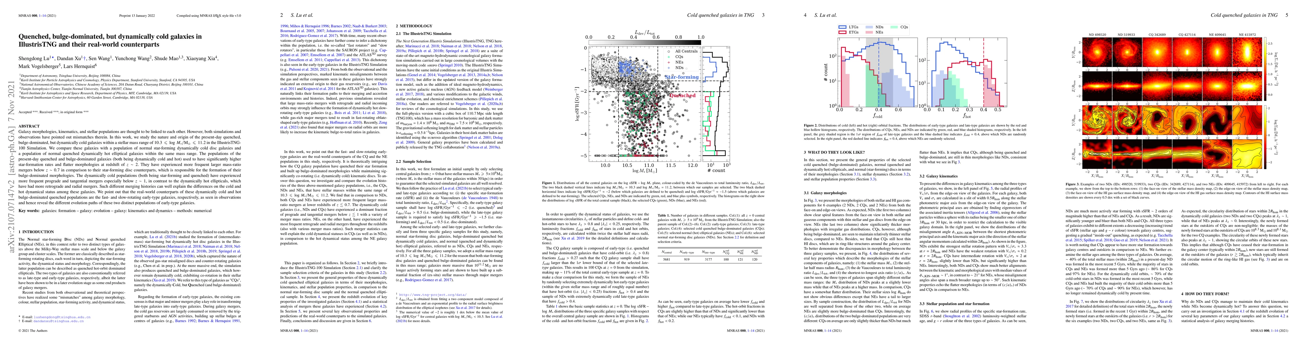 This paper investigates the nature and evolution of quenched, bulge-dominated, dynamically cold galaxies in the IllustrisTNG-100 simulation. It finds that these galaxies have distinct merging histories compared to star-forming discs and dynamically hot elliptical galaxies, explaining their cold dynamical status and different evolutionary paths.