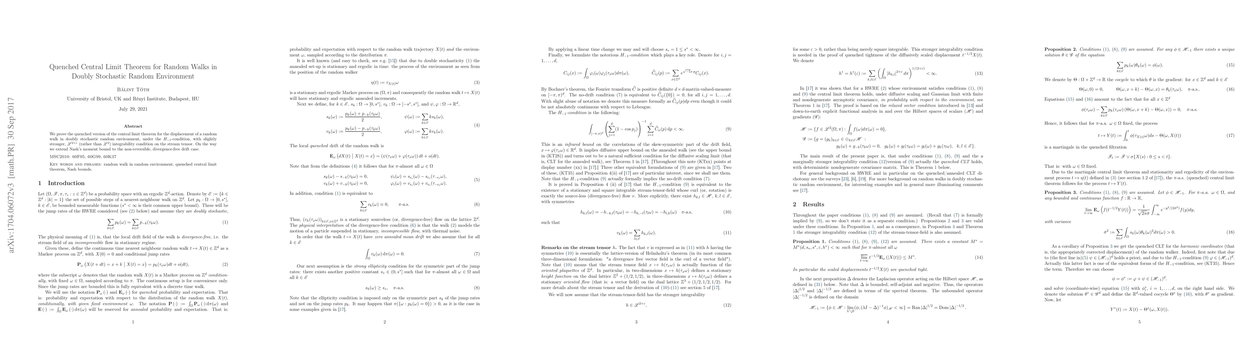 We prove the quenched version of the central limit theorem for the displacement of a random walk in doubly stochastic random environment, under the $H_{-1}$-condition, with slightly stronger, $L^{2+\varepsilon}$ (rather than $L^2$) integrability condition on the stream tensor. On the way we extend Nash's moment bound to the non-reversible, divergence-free drift case.