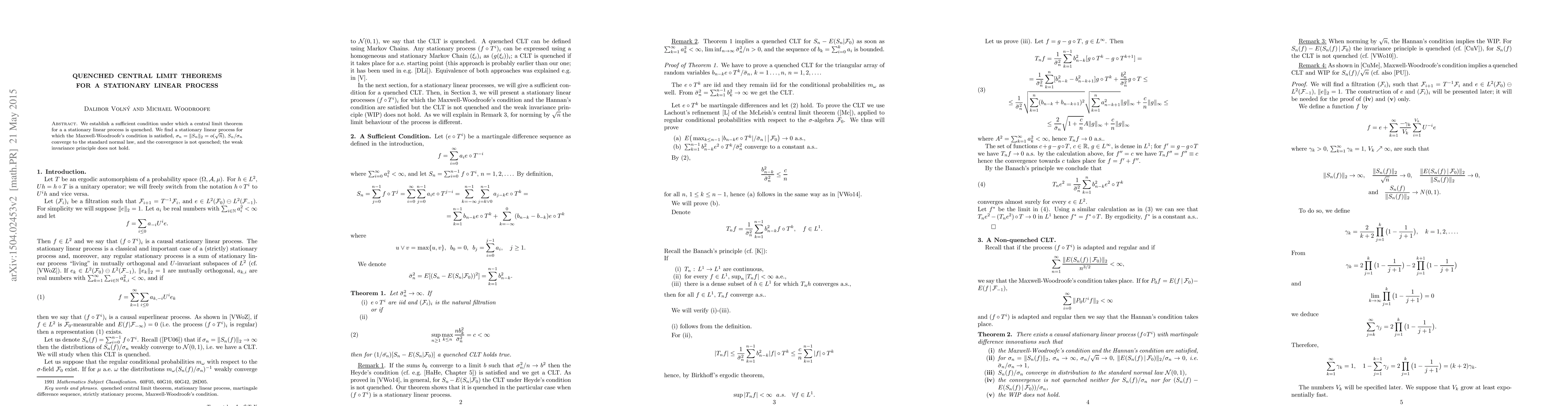We find a sufficient condition under which a central limit theorem for a stationary linear process is quenched. We find a stationary linear process szatisfying the Maxwell-Woodroofe condition for which the variances of partial sums are o(n), there is a CLT with a convergence towards N(0,1) when dividing by standard deviation of the partial sums, and the CLT is not quenched. The weak invariance principle does not hold.