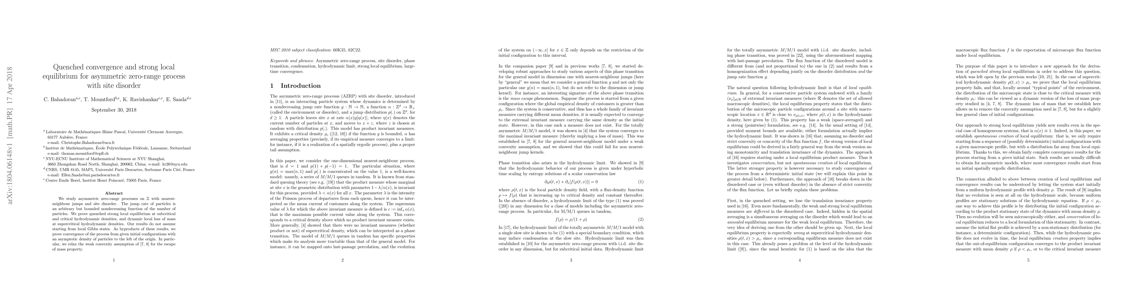 We study asymmetric zero-range processes on Z with nearest-neighbour jumps and site disorder. The jump rate of particles is an arbitrary but bounded nondecreasing function of the number of particles. We prove quenched strong local equilibrium at subcritical and critical hydrodynamic densities, and dynamic local loss of mass at supercritical hydrodynamic densities. Our results do not assume starting from local Gibbs states. As byproducts of these results, we prove convergence of the process from given initial configurations with an asymptotic density of particles to the left of the origin. In particular , we relax the weak convexity assumption of [7, 8] for the escape of mass property. 1 MSC 2010 subject classification: 60K35, 82C22.