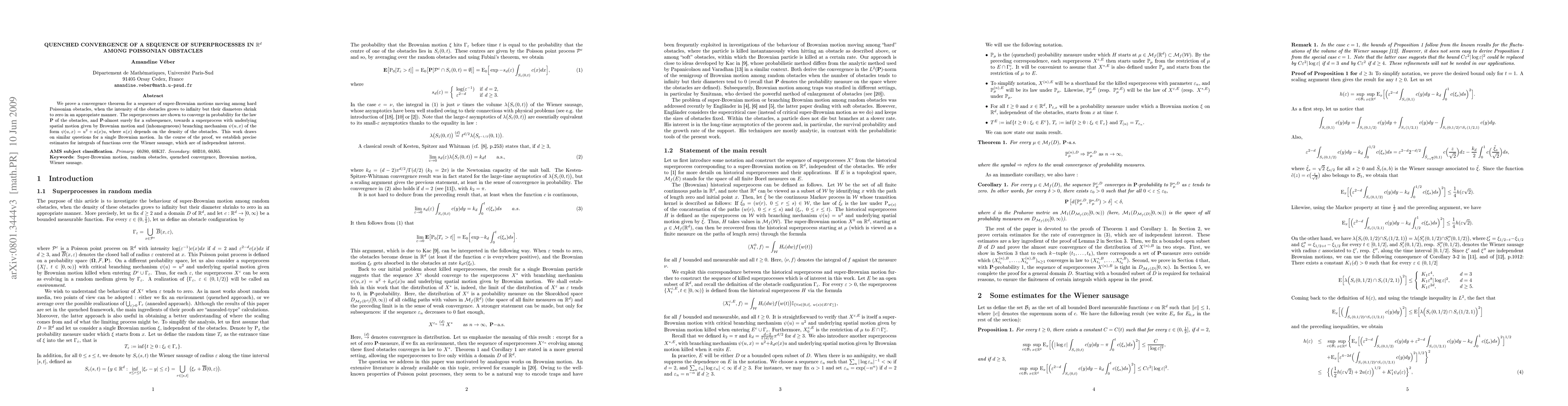 This paper proves the quenched convergence of a sequence of super-Brownian motions navigating through shrinking Poissonian obstacles, showing they converge towards a superprocess driven by Brownian motion with a branching mechanism dependent on obstacle density. The proof includes valuable estimates for integrals over the Wiener sausage.