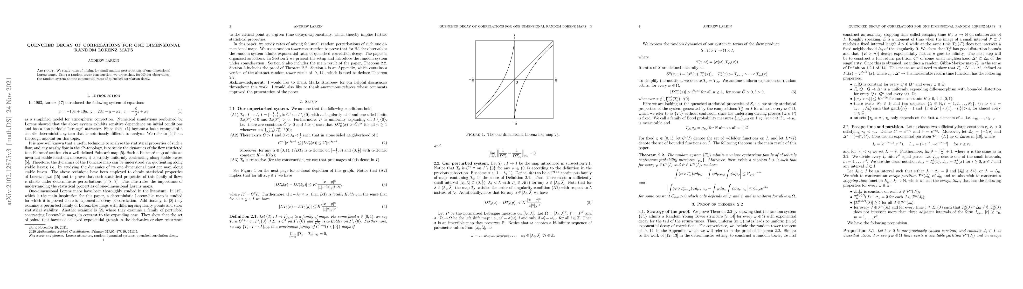 Summary: This paper investigates the mixing rates of small random perturbations in one-dimensional Lorenz maps, demonstrating exponential decay of correlations for Hölder observables through a random tower construction. The study focuses on the phenomenon of quenched decay of correlations in this random dynamical system.