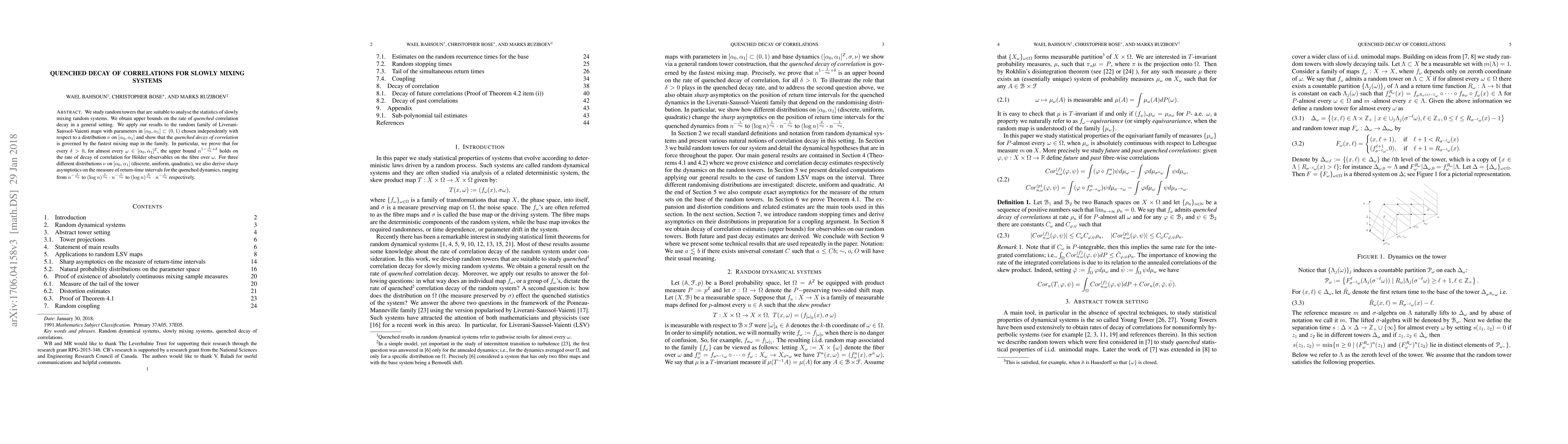 This paper investigates the decay of correlations in slowly mixing random systems using random towers, establishing upper bounds on the quenched decay rate. It applies these results to a random family of Liverani-Saussol-Vaienti maps, showing that the fastest mixing map dictates the decay rate, and derives sharp asymptotics for the measure of return-time intervals under different distributions.