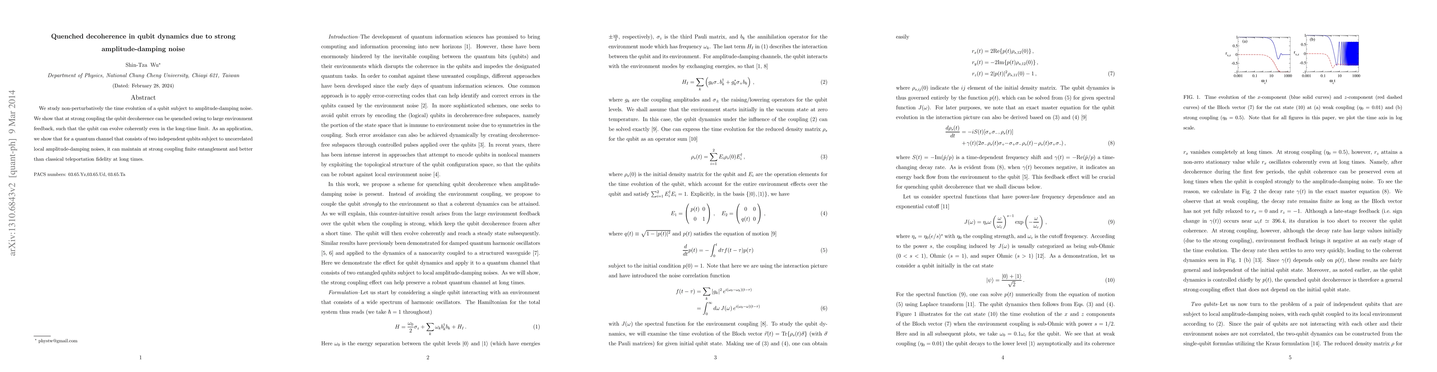 We study non-perturbatively the time evolution of a qubit subject to amplitude-damping noise. We show that at strong coupling the qubit decoherence can be quenched owing to large environment feedbacks, such that the qubit can evolve coherently even in the long-time limit. As an application, we show that for a quantum channel that consists of two independent qubits subject to uncorrelated local amplitude-damping noises, it can maintain at strong coupling finite entanglement and better than classical teleportation fidelity at long times.