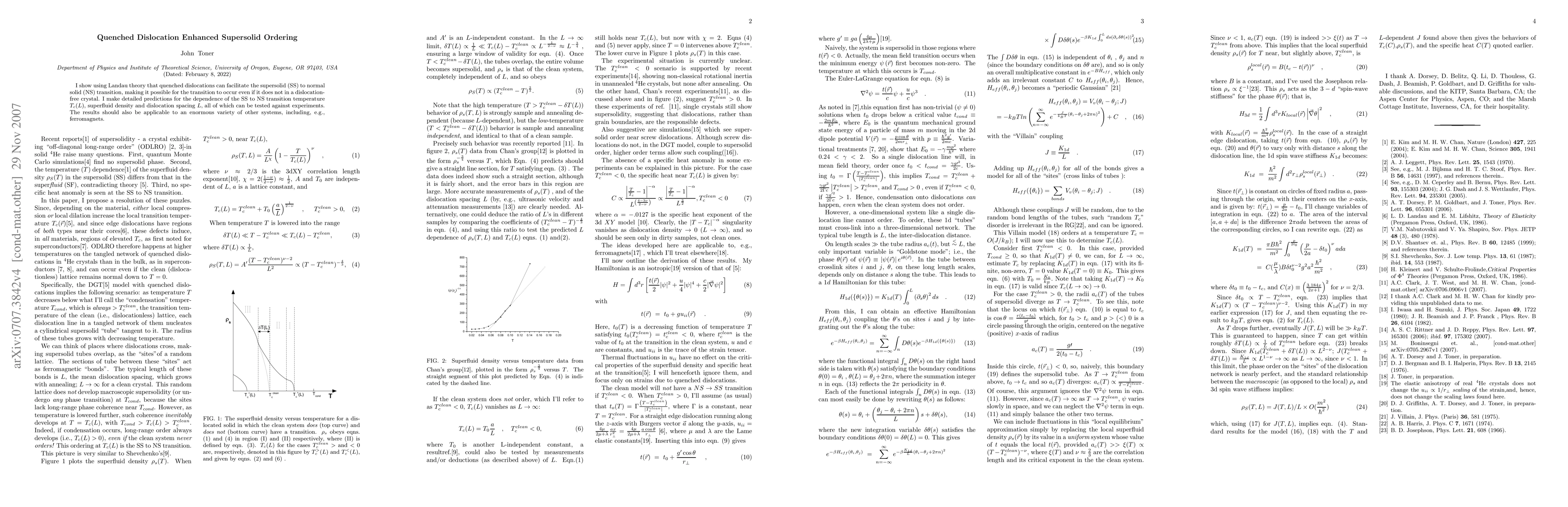 This paper demonstrates that quenched dislocations can enable the transition from supersolid to normal solid states, using Landau theory, and provides predictions for the transition temperature, superfluid density, and specific heat dependent on temperature and dislocation spacing, applicable to various systems like ferromagnets. Experimental validation of these predictions is proposed.