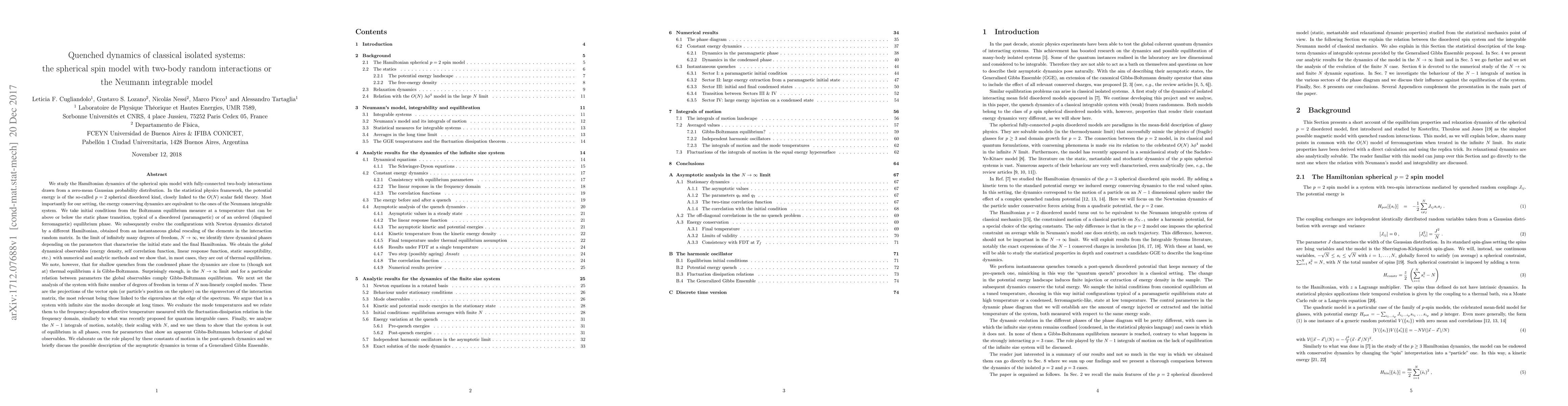 We study the Hamiltonian dynamics of the spherical spin model with fully-connected two-body interactions drawn from a Gaussian probability distribution. In the statistical physics framework, the potential energy is of the so-called $p=2$ spherical disordered kind. Most importantly for our setting, the energy conserving dynamics are equivalent to the ones of the Neumann integrable system. We take initial conditions in thermal equilibrium and we subsequently evolve the configurations with Newton dynamics dictated by a different Hamiltonian. We identify three dynamical phases depending on the parameters that characterise the initial state and the final Hamiltonian. We obtain the {\it global} dynamical observables with numerical and analytic methods and we show that, in most cases, they are out of thermal equilibrium. We note, however, that for shallow quenches from the condensed phase the dynamics are close to (though not at) thermal equilibrium. Surprisingly enough, for a particular relation between parameters the global observables comply Gibbs-Boltzmann equilibrium. We next set the analysis of the system with finite number of degrees of freedom in terms of $N$ non-linearly coupled modes. We evaluate the mode temperatures and we relate them to the frequency-dependent effective temperature measured with the fluctuation-dissipation relation in the frequency domain, similarly to what was recently proposed for quantum integrable cases. Finally, we analyse the $N-1$ integrals of motion and we use them to show that the system is out of equilibrium in all phases, even for parameters that show an apparent Gibbs-Boltzmann behaviour of global observables. We elaborate on the role played by these constants of motion in the post-quench dynamics and we briefly discuss the possible description of the asymptotic dynamics in terms of a Generalised Gibbs Ensemble.