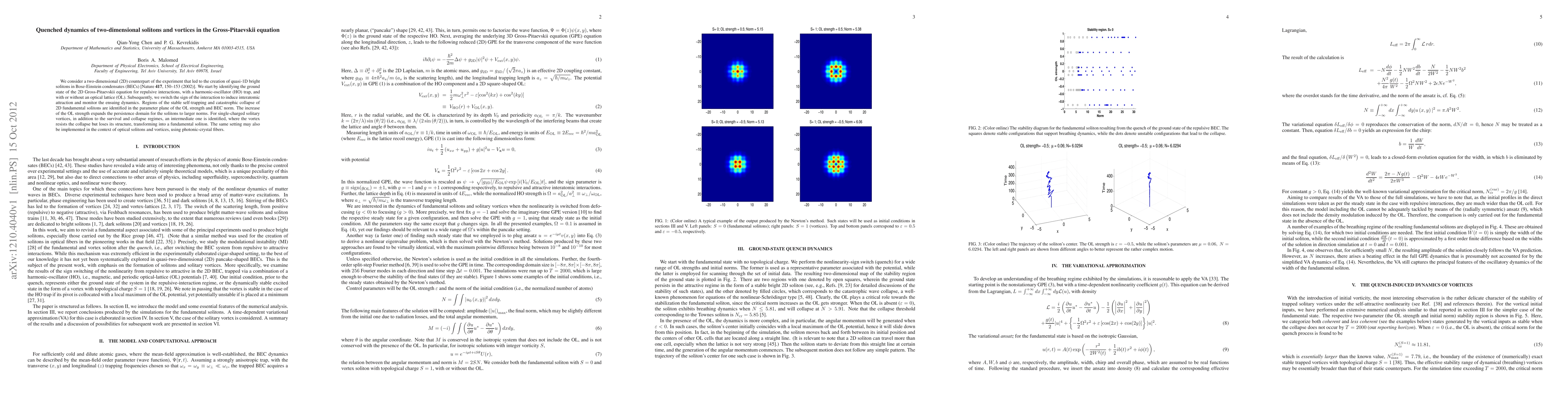 This paper investigates the dynamics of two-dimensional solitons and vortices in the Gross-Pitaevskii equation, identifying stable self-trapping and collapse regimes for solitons and an intermediate regime for vortices where they transform into fundamental solitons. The optical lattice strength influences soliton persistence.