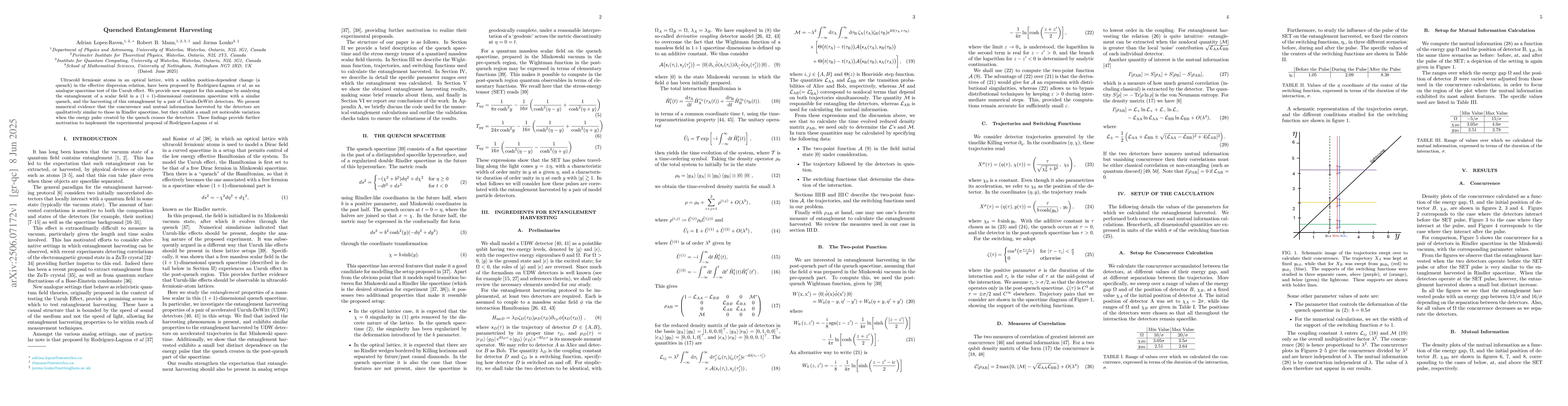 Ultracold fermionic atoms in an optical lattice, with a sudden position-dependent change (a quench) in the effective dispersion relation, have been proposed by Rodr\'iguez-Laguna et al as an analogue spacetime test of the Unruh effect. We provide new support for this analogue by analysing the entanglement of a scalar field in a (1 + 1)-dimensional continuum spacetime with a similar quench, and the harvesting of this entanglement by a pair of Unruh-DeWitt detectors. We present numerical evidence that the concurrence and mutual information harvested by the detectors are qualitatively similar to those in Rindler spacetime, but they exhibit a small yet noticeable variation when the energy pulse created by the quench crosses the detectors. These findings provide further motivation to implement the experimental proposal of Rodr\'iguez-Laguna et al.