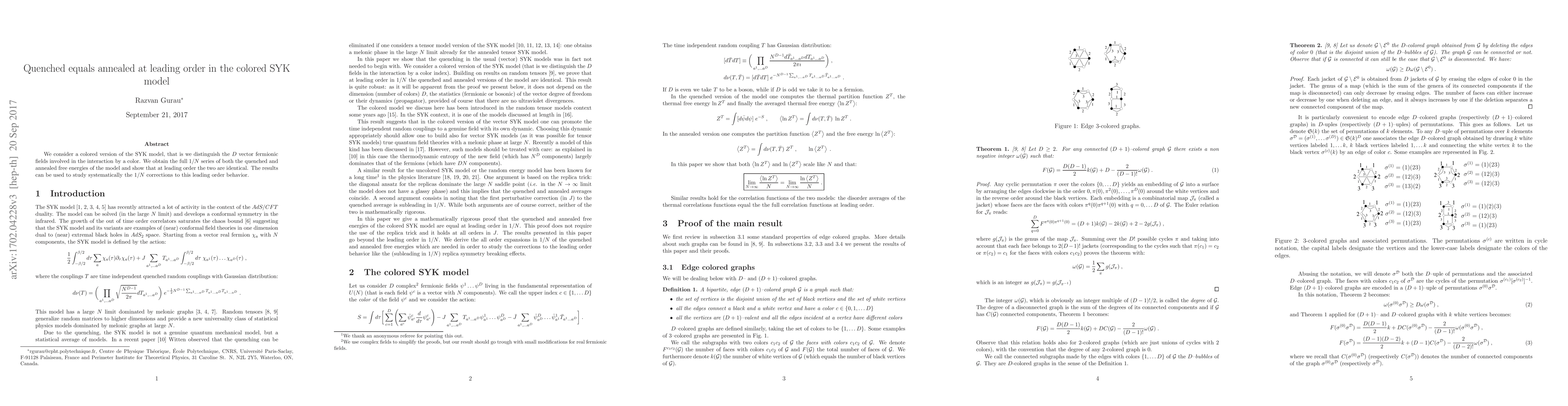 We consider a colored version of the SYK model, that is we distinguish the $D$ vector fermionic fields involved in the interaction by a color. We obtain the full $1/N$ series of both the quenched and annealed free energies of the model and show that at leading order the two are identical. The results can be used to study systematically the $1/N$ corrections to this leading order behavior.