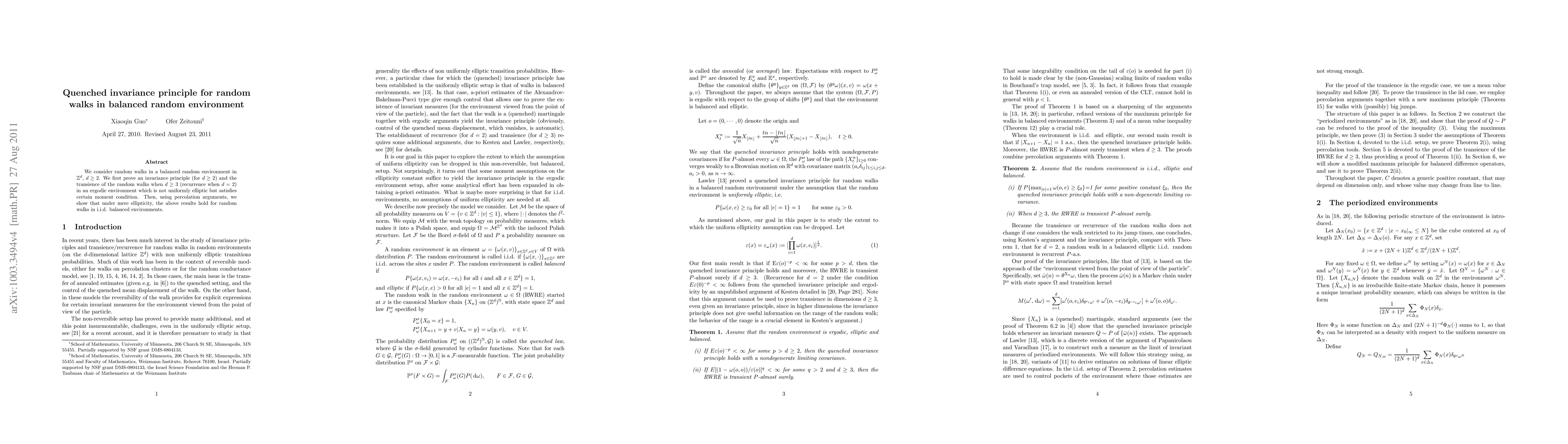 We consider random walks in a balanced random environment in $\mathbb{Z}^d$, $d\geq 2$. We first prove an invariance principle (for $d\ge2$) and the transience of the random walks when $d\ge 3$ (recurrence when $d=2$) in an ergodic environment which is not uniformly elliptic but satisfies certain moment condition. Then, using percolation arguments, we show that under mere ellipticity, the above results hold for random walks in i.i.d. balanced environments.