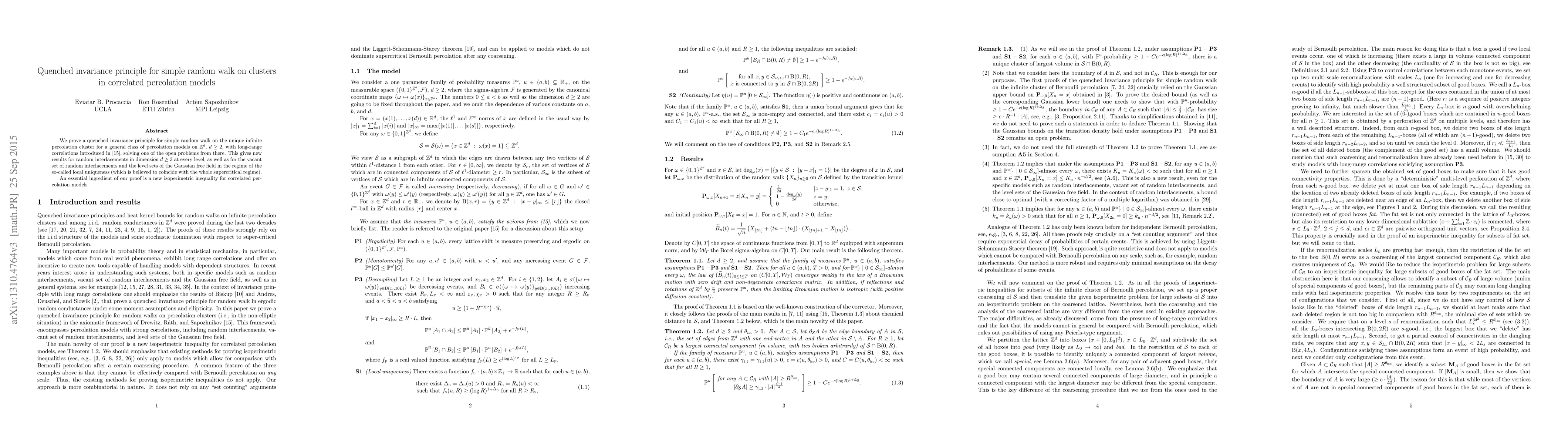 This paper proves a quenched invariance principle for simple random walk on the infinite percolation cluster in correlated percolation models, solving an open problem and providing new insights into random interlacements and Gaussian free field in supercritical regimes. The proof relies on a novel isoperimetric inequality for correlated percolation models.