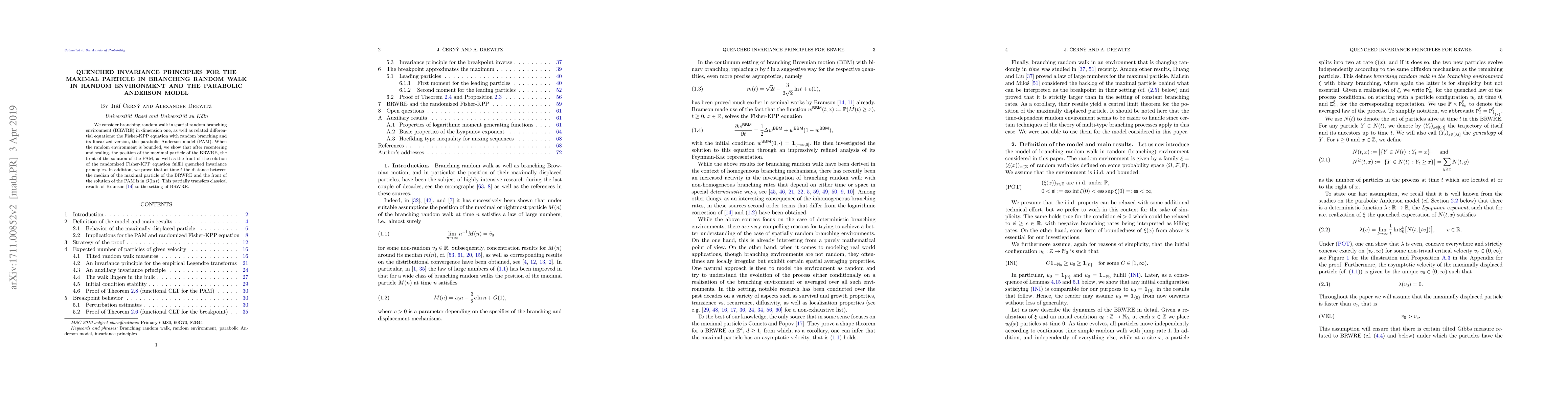 We consider branching random walk in spatial random branching environment (BRWRE) in dimension one, as well as related differential equations: the Fisher-KPP equation with random branching and its linearized version, the parabolic Anderson model (PAM). When the random environment is bounded, we show that after recentering and scaling, the position of the maximal particle of the BRWRE, the front of the solution of the PAM, as well as the front of the solution of the randomized Fisher-KPP equation fulfill quenched invariance principles. In addition, we prove that at time t the distance between the median of the maximal particle of the BRWRE and the front of the solution of the PAM is in O(ln t). This partially transfers results from Bramson [Comm. Pure Appl. Math. 31 (1978), no. 5, 531--581] to the setting of BRWRE.