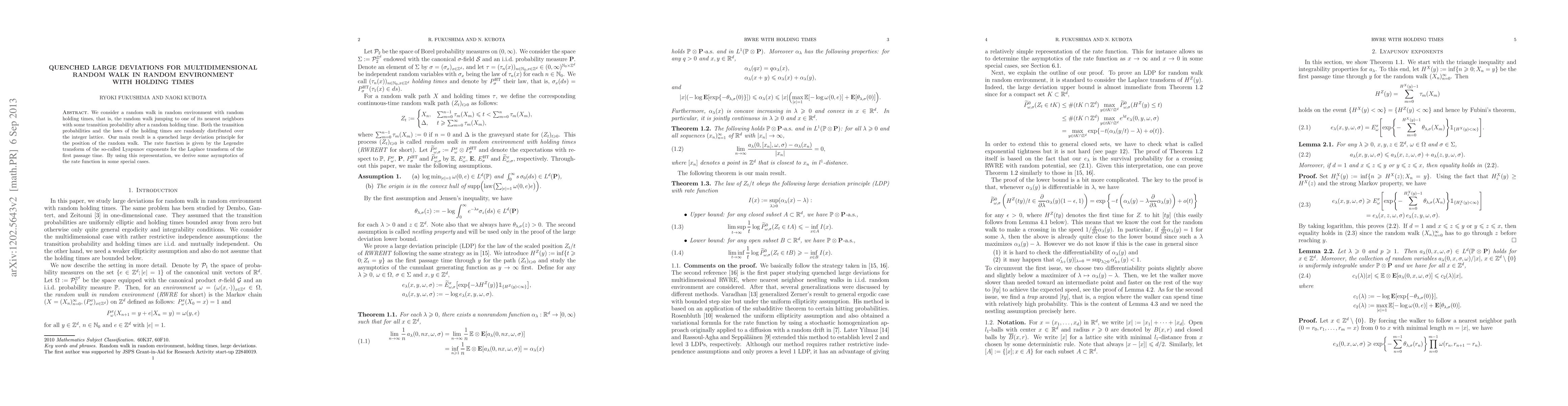 This paper investigates a random walk in a random environment with random holding times, deriving a quenched large deviation principle for the walk's position. The rate function is expressed through the Legendre transform of Lyapunov exponents for the Laplace transform of the first passage time, with specific asymptotics derived in special cases.