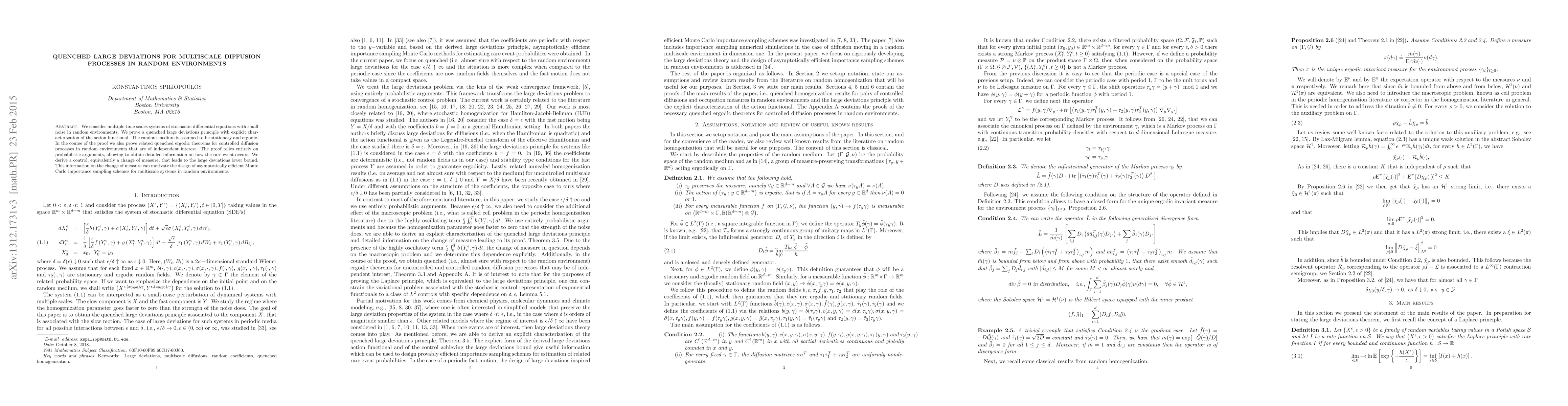 This paper proves a quenched large deviations principle for multiscale diffusion processes in random, stationary, and ergodic environments, providing an explicit characterization of the action functional. It also establishes related quenched ergodic theorems and suggests the potential for designing efficient Monte Carlo importance sampling schemes.