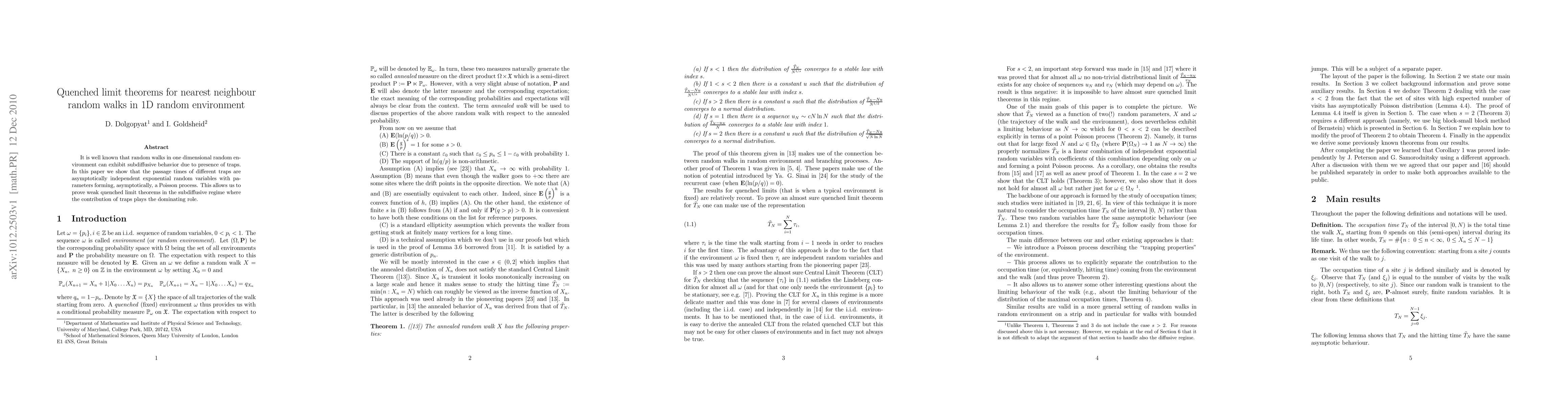 This paper demonstrates that passage times of traps in 1D random environment random walks follow asymptotically independent exponential distributions, forming a Poisson process, and proves weak quenched limit theorems in the subdiffusive regime dominated by trap effects.