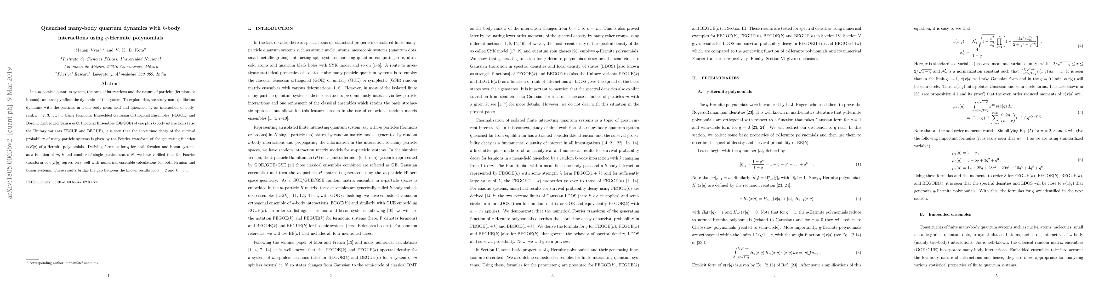 In a $m$ particle quantum system, one can have $k=1,\,2,\,\ldots,\,m$ body interactions. The rank of interactions and the nature of particles (fermions or bosons) can strongly affect the dynamics of the system. To explore this in detail, we study quenched quantum dynamics in many particle systems varying rank of interactions, both for fermionic and bosonic particles. We represent the system Hamiltonian by Fermionic Embedded Gaussian Orthogonal Ensembles (FEGOE) and Bosonic Embedded Gaussian Orthogonal Ensembles (BEGOE) respectively. We show that generating function for $q$-Hermite polynomials describes the semi-circle to Gaussian transition in spectral densities of FEGOE$(k)$ and BEGOE$(k)$ (also the Unitary variants FEGUE$(k)$ and BEGUE$(k)$) as a function of rank of interactions $k$. Importantly, numerical Fourier transform of generating function of $q$-Hermite polynomials explains the short-time decay of survival probability in FEGOE$(1+k)$ and BEGOE$(1+k)$. The parameter $q$ describing these properties is related to excess parameter $\gamma_2$ and we give a formula for FEGOE$(k)$, FEGUE$(k)$, BEGOE$(k)$ and BEGUE$(k)$. We illustrate that the dynamics strongly depends on the rank of interactions and nature of particles and these universal features may be relevant to modeling non-equilibrium quantum systems.