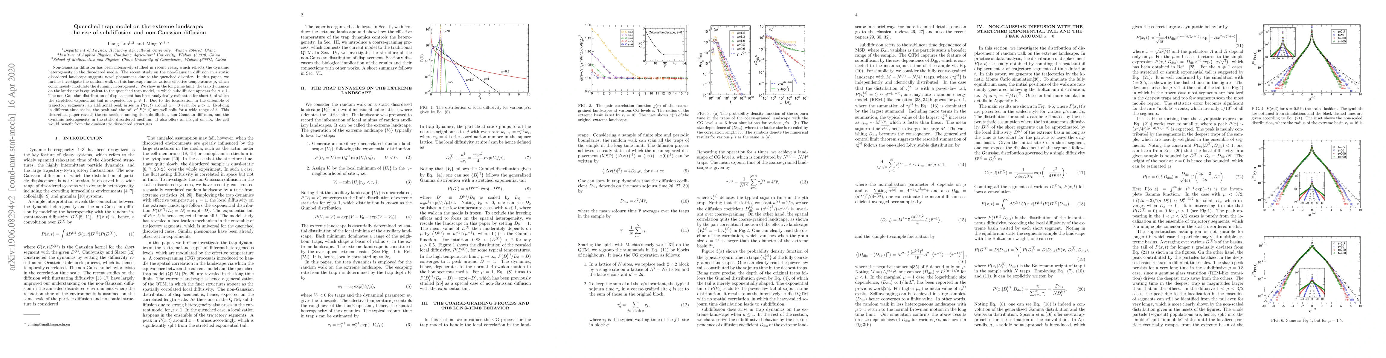 Non-Gaussian diffusion has been intensively studied in recent years, which reflects the dynamic heterogeneity in the disordered media. The recent study on the non-Gaussian diffusion in a static disordered landscape suggests novel phenomena due to the quenched disorder. In this work, we further investigate the random walk in this landscape under various effective temperature $\mu$, which continuously modulates the dynamic heterogeneity. We show in the long time limit, the trap dynamics on the landscape is equivalent to the quenched trap model, in which sub-diffusion appears for $\mu<1$. The non-Gaussian distribution of displacement has been analytically estimated for short $t$, of which the stretched exponential tail is expected for $\mu\neq1$. Due to the localization in the ensemble of trajectory segments, an additional peak arises in $P(x,t)$ around $x=0$ even for $\mu>1$. Evolving in different time scales, the peak and the tail of $P(x,t)$ are well split for a wide range of $t$. This theoretical study reveals the connections among the sub-diffusion, non-Gaussian diffusion, and the dynamic heterogeneity in the static disordered medium. It also offers an insight on how the cell would benefit from the quasi-static disordered structures.