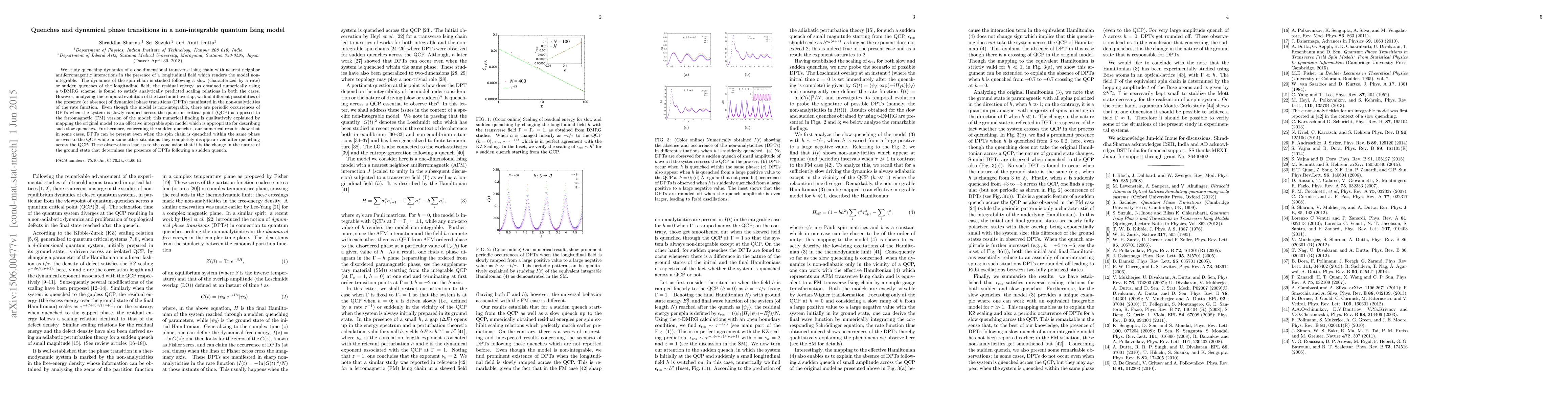 This paper investigates the quenching dynamics of a non-integrable 1D Ising model with antiferromagnetic interactions, revealing periodic dynamical phase transitions during slow ramps across the quantum critical point. Sudden quenches show varying presence of DPTs, suggesting that the ground state's nature dictates their occurrence.