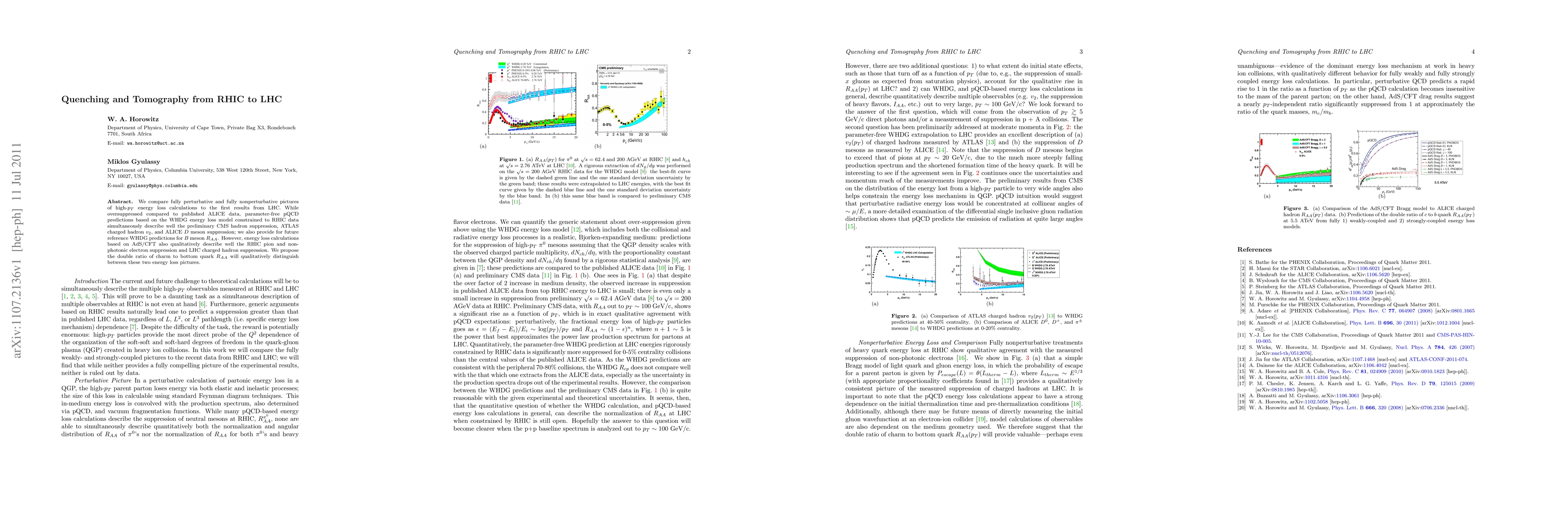 We compare fully perturbative and fully nonperturbative pictures of high-pT energy loss calculations to the first results from LHC. While over-suppressed compared to published ALICE data, parameter-free pQCD predictions based on the WHDG energy loss model constrained to RHIC data simultaneously describe well the preliminary CMS hadron suppression, ATLAS charged hadron v2, and ALICE D meson suppression; we also provide for future reference WHDG predictions for B meson RAA. However, energy loss calculations based on AdS/CFT also qualitatively describe well the RHIC pion and non-photonic electron suppression and LHC charged hadron suppression. We propose the double ratio of charm to bottom quark RAA will qualitatively distinguish between these two energy loss pictures.