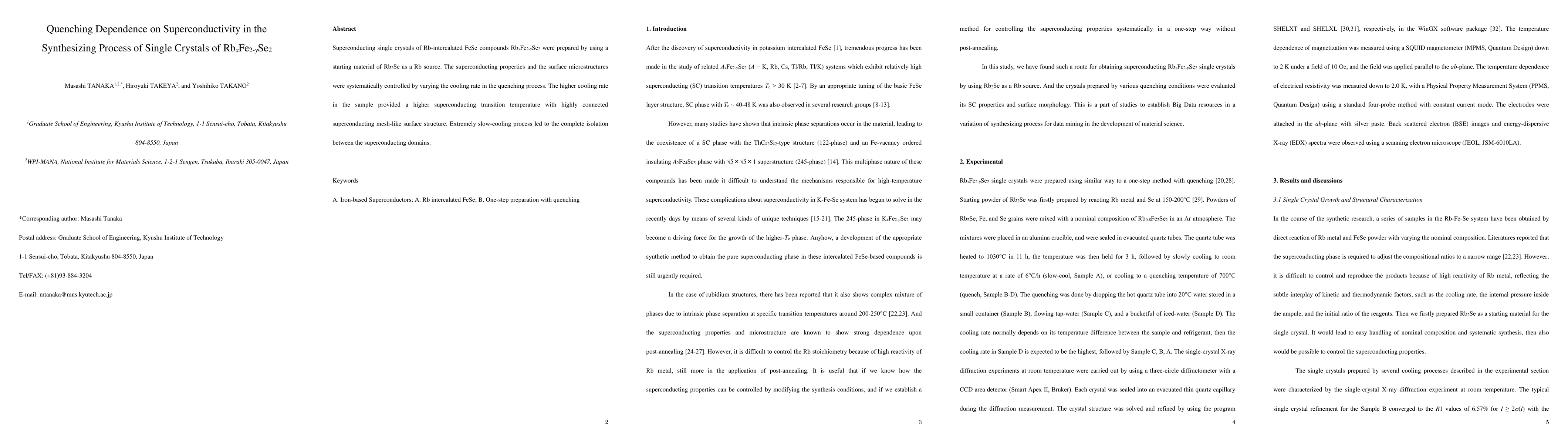 This study investigates the impact of quenching cooling rates on the superconducting properties of Rb$_x$Fe$_{2-y}$Se$_2$ single crystals. Higher cooling rates enhance the superconducting transition temperature and create a mesh-like surface structure, while extremely slow cooling isolates the superconducting domains.