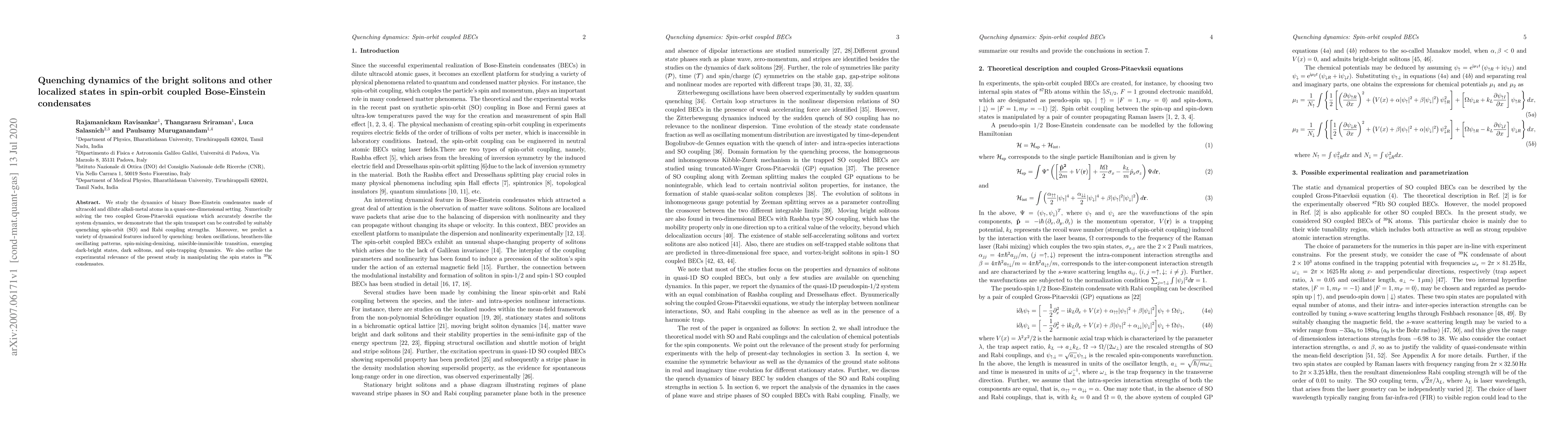 This paper investigates the quenching dynamics of solitons and localized states in spin-orbit coupled Bose-Einstein condensates, demonstrating controllable spin transport through quenching spin-orbit and Rabi coupling strengths, and predicting diverse dynamical phenomena such as broken oscillations, breathers, and solitons. The study highlights its experimental applicability in $^{39}$K condensates.