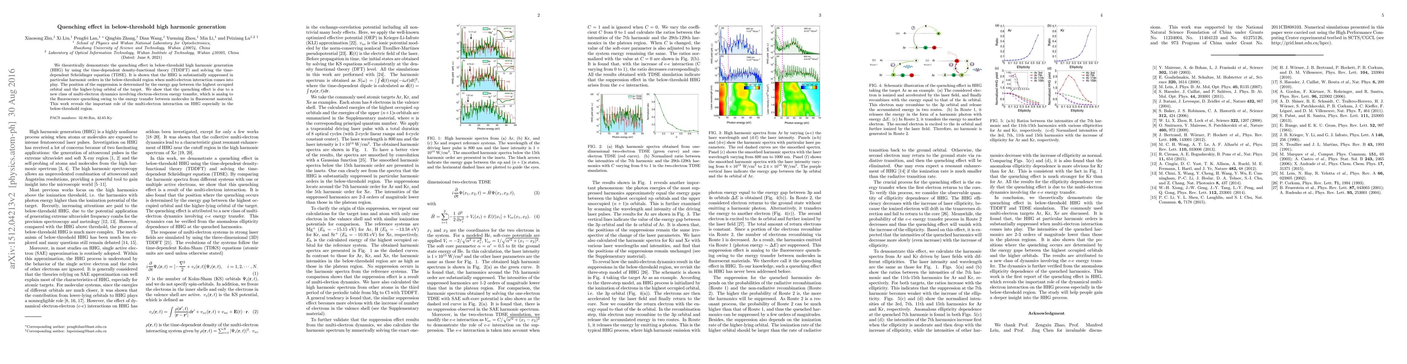 This paper demonstrates the quenching effect in below-threshold high harmonic generation (HHG) using TDDFT and TDSE, revealing substantial suppression in specific harmonic orders due to multi-electron interactions. The suppression's position is determined by the energy gap between orbitals, and it arises from a new class of multi-electron dynamics involving electron-electron energy transfer.