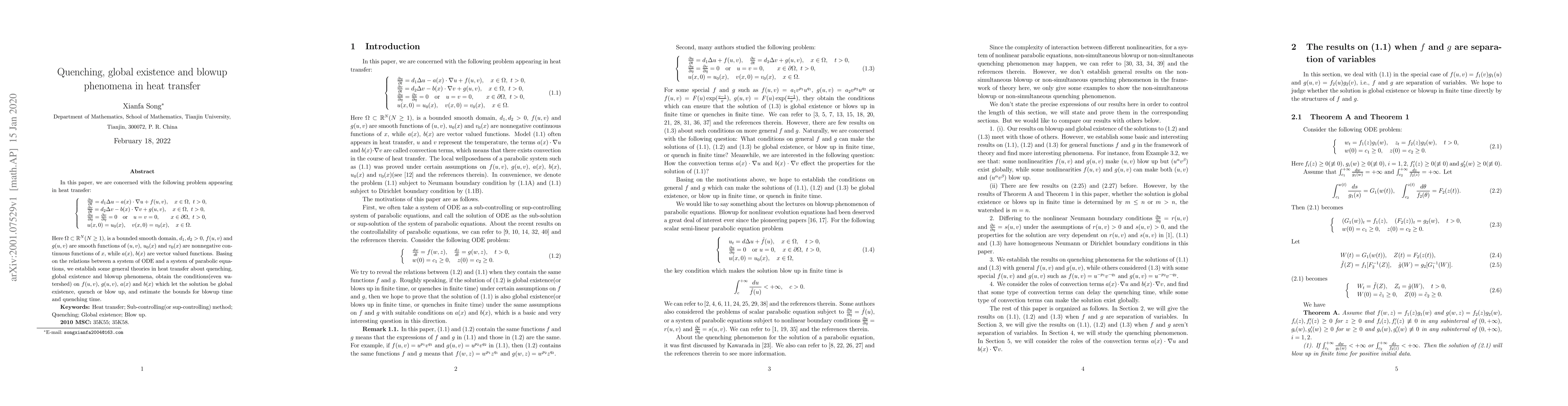 This paper develops general theories for heat transfer concerning quenching, global existence, and blowup phenomena, establishing conditions for these behaviors based on relationships between ODEs and parabolic equations, and estimating bounds for blowup and quenching times.