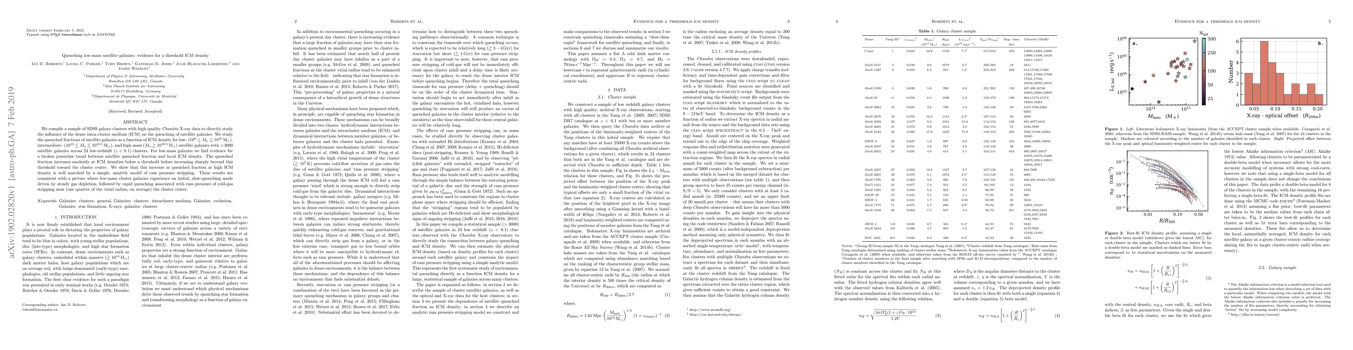 This study examines the quenching of satellite galaxies in galaxy clusters, finding that low-mass galaxies exhibit a threshold intra-cluster medium (ICM) density for significant quenching. The quenched fraction increases sharply beyond this threshold, suggesting a transition from slow gas depletion to rapid ram pressure stripping.