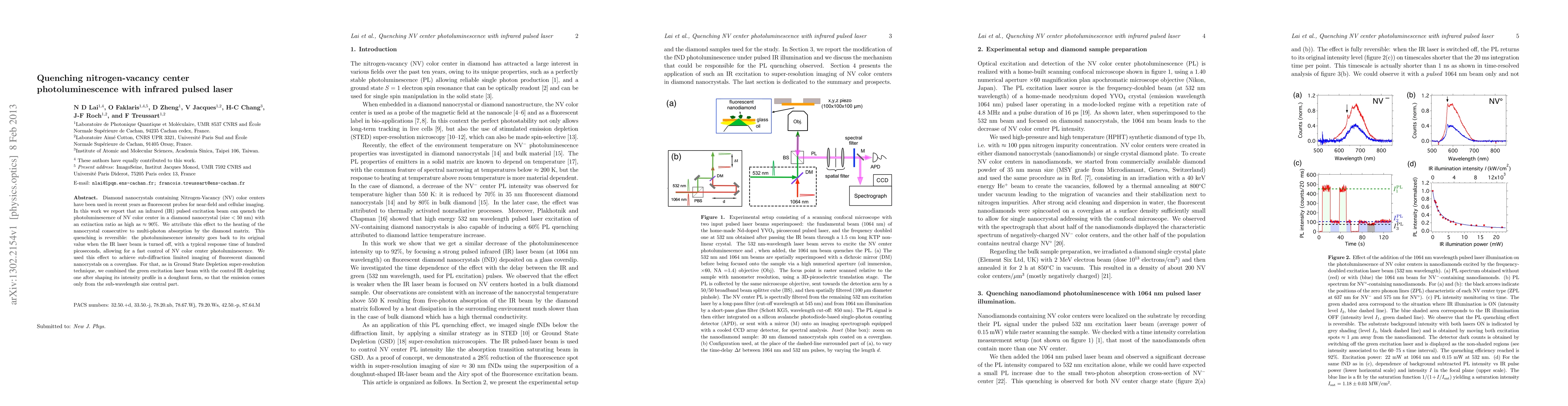 This paper investigates the quenching of nitrogen-vacancy center photoluminescence in diamond nanocrystals using an infrared pulsed laser, achieving a reversible extinction ratio of ~90% due to nanocrystal heating. This effect enables sub-diffraction limited imaging by controlling the NV center's fluorescence with a response time of hundred picoseconds.