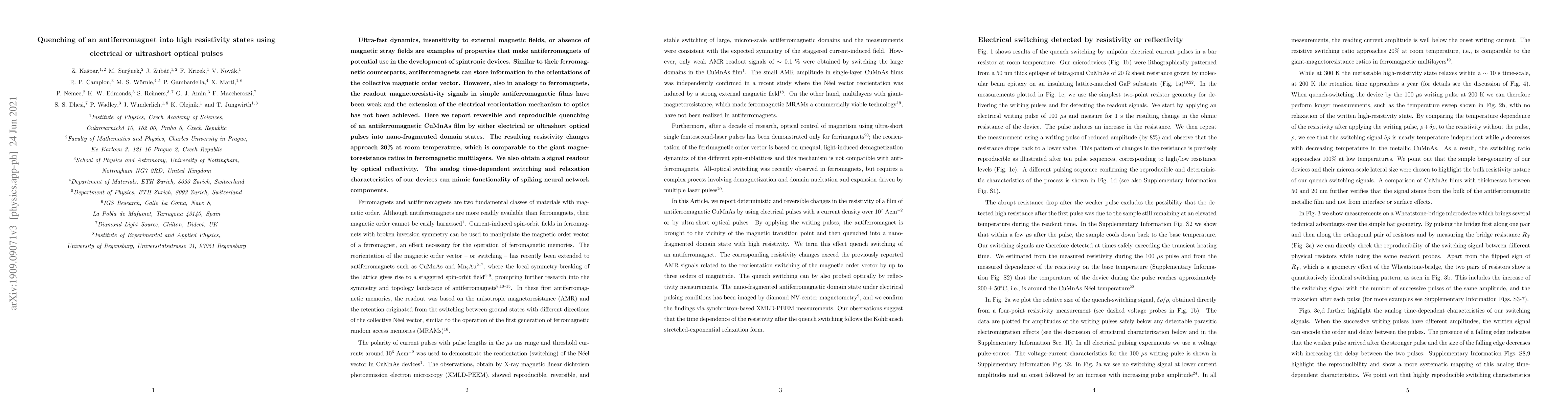Ultra-fast dynamics, insensitivity to external magnetic fields, or absence of magnetic stray fields are examples of properties that make antiferromagnets of potential use in the development of spintronic devices. Similar to their ferromagnetic counterparts, antiferromagnets can store information in the orientations of the collective magnetic order vector. However, also in analogy to ferromagnets, the readout magnetoresistivity signals in simple antiferromagnetic films have been weak and the extension of the electrical reorientation mechanism to optics has not been achieved. Here we report reversible and reproducible quenching of an antiferromagnetic CuMnAs film by either electrical or ultrashort optical pulses into nano-fragmented domain states. The resulting resistivity changes approach 20\% at room temperature, which is comparable to the giant magnetoresistance ratios in ferromagnetic multilayers. We also obtain a signal readout by optical reflectivity. The analog time-dependent switching and relaxation characteristics of our devices can mimic functionality of spiking neural network components.