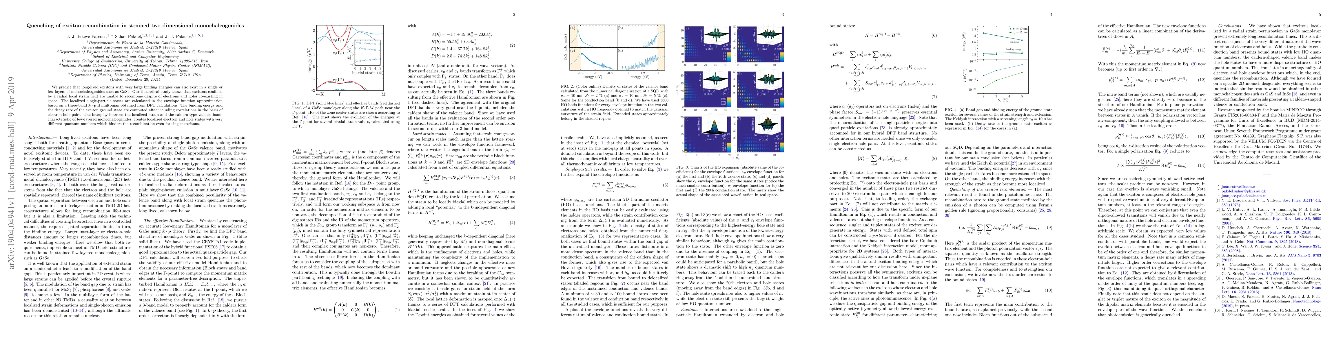 This paper predicts the existence of long-lived excitons in strained two-dimensional monochalcogenides like GaSe. Theoretical analysis shows that radial local strain fields prevent exciton recombination, despite electrons and holes coexisting in space, due to the distinct quantum states created by the strain and the caldera-type valence band structure.