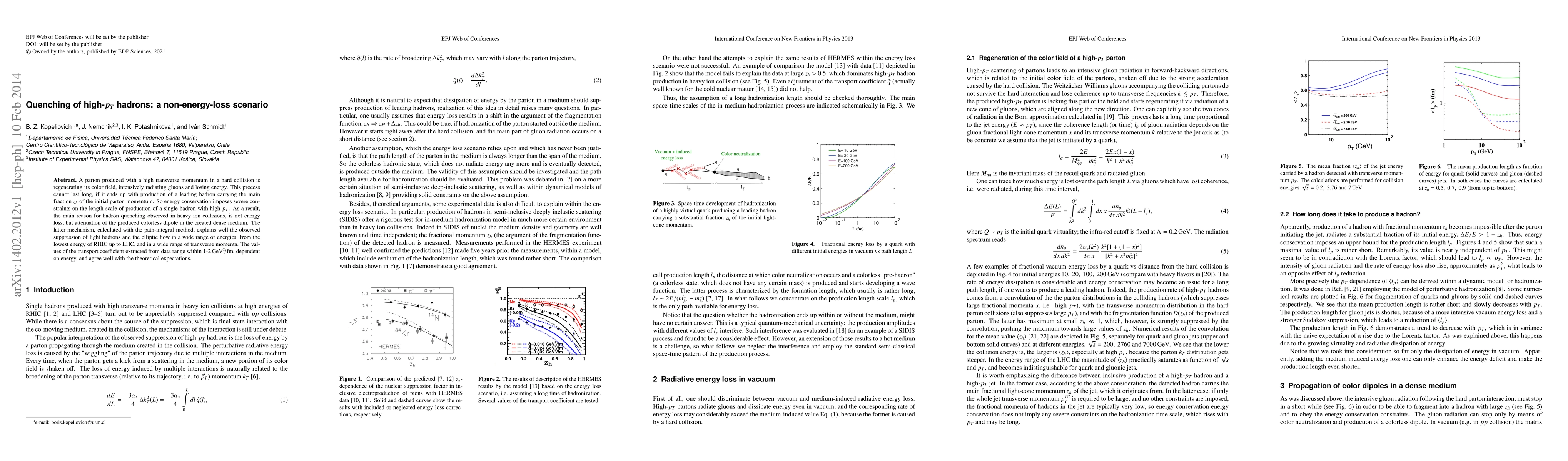 A parton produced with a high transverse momentum in a hard collision is regenerating its color field, intensively radiating gluons and losing energy. This process cannot last long, if it ends up with production of a leading hadron carrying the main fraction z_h of the initial parton momentum. So energy conservation imposes severe constraints on the length scale of production of a single hadron with high pT. As a result, the main reason for hadron quenching observed in heavy ion collisions, is not energy loss, but attenuation of the produced colorless dipole in the created dense medium. The latter mechanism, calculated with the path-integral method, explains well the observed suppression of light hadrons and the elliptic flow in a wide range of energies, from the lowest energy of RHIC up to LHC, and in a wide range of transverse momenta. The values of the transport coefficient extracted from data range within 1-2 GeV^2/fm, dependent on energy, and agree well with the theoretical expectations.