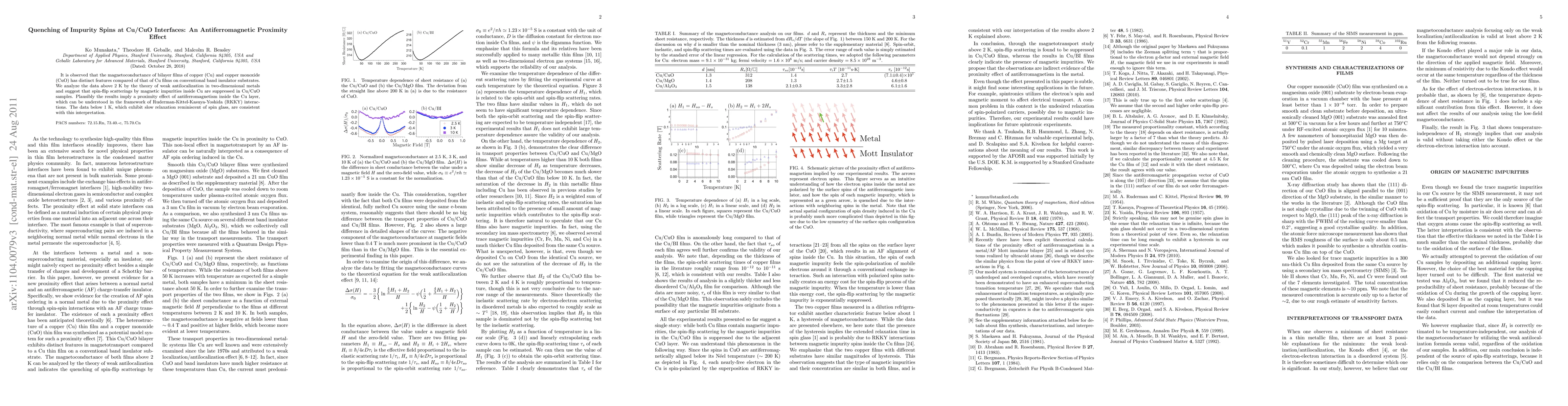 It is observed that the magnetoconductance of bilayer films of copper (Cu) and copper monoxide (CuO) has distinct features compared of that of Cu films on conventional band insulator substrates. We analyze the data above 2 K by the theory of weak antilocalization in two-dimensional metals and suggest that spin-flip scatterings by magnetic impurities inside Cu are suppressed in Cu/CuO samples. Plausibly the results imply a proximity effect of antiferromagnetism inside the Cu layer, which can be understood in the framework of Ruderman-Kittel-Kasuya-Yoshida (RKKY) interactions. The data below 1 K, which exhibit slow relaxation reminiscent of spin glass, are consistent with this interpretation.