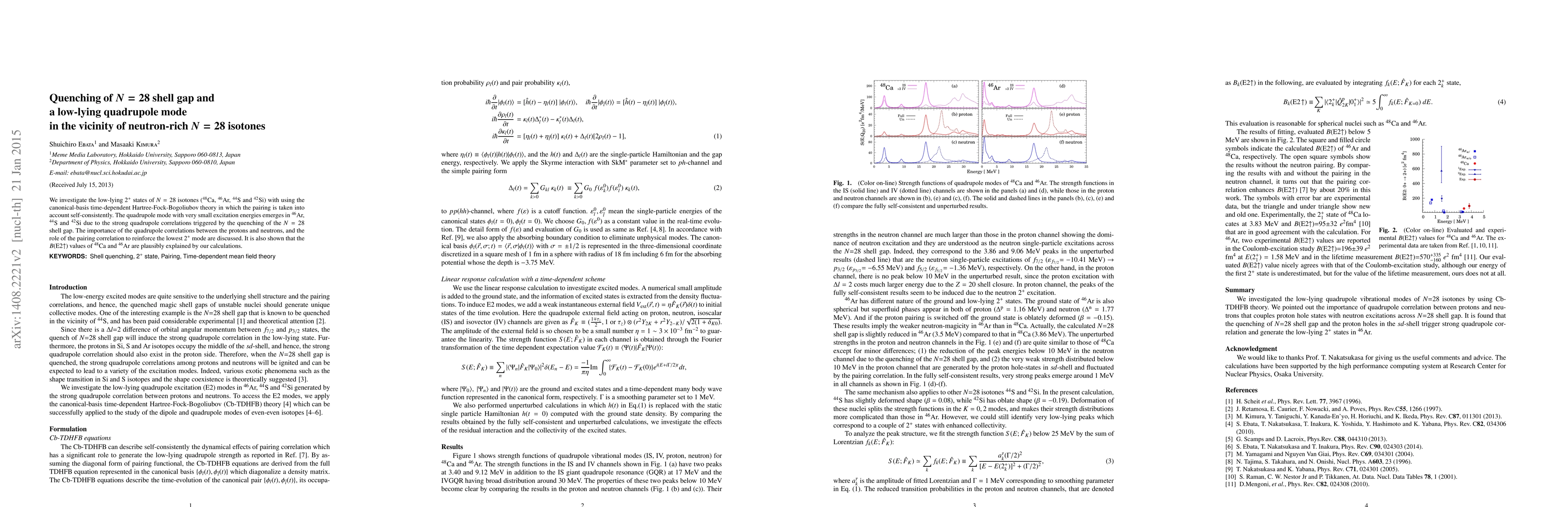 We investigate the low-lying 2$^+$ states of $N=28$ isotones ($^{48}$Ca, $^{46}$Ar, $^{44}$S and $^{42}$Si) with using the canonical-basis time-dependent Hartree-Fock-Bogoliubov theory in which the pairing is taken into account self-consistently. The quadrupole mode with very small excitation energies emerges in $^{46}$Ar, $^{44}$S and $^{42}$Si due to the strong quadrupole correlations triggered by the quenching of the $N=28$ shell gap. The importance of the quadrupole correlations between the protons and neutrons, and the role of the pairing correlation to reinforce the lowest 2$^+$ mode are discussed. It is also shown that the $B$(E2$\uparrow$) values of $^{48}$Ca and $^{46}$Ar are plausibly explained by our calculations.