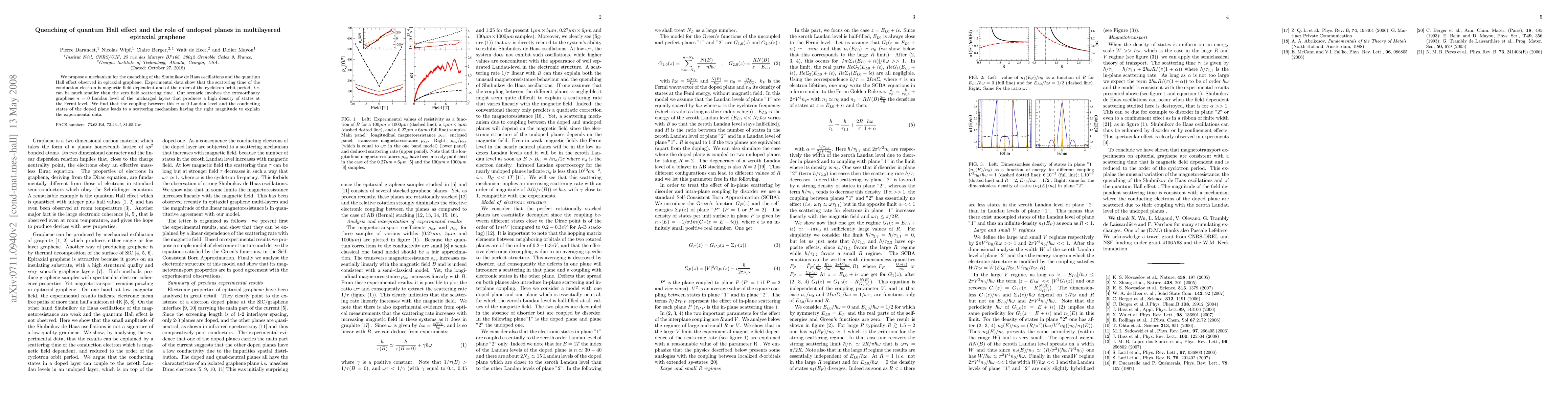 We propose a mechanism for the quenching of the Shubnikov de Haas oscillations and the quantum Hall effect observed in epitaxial graphene. Experimental data show that the scattering time of the conduction electron is magnetic field dependent and of the order of the cyclotron orbit period, \textit{i.e.} can be much smaller than the zero field scattering time. Our scenario involves the extraordinary graphene $n=0$ Landau level of the uncharged layers that produces a high density of states at the Fermi level. We find that the coupling between this $n=0$ Landau level and the conducting states of the doped plane leads to a scattering mechanism having the right magnitude to explain the experimental data.