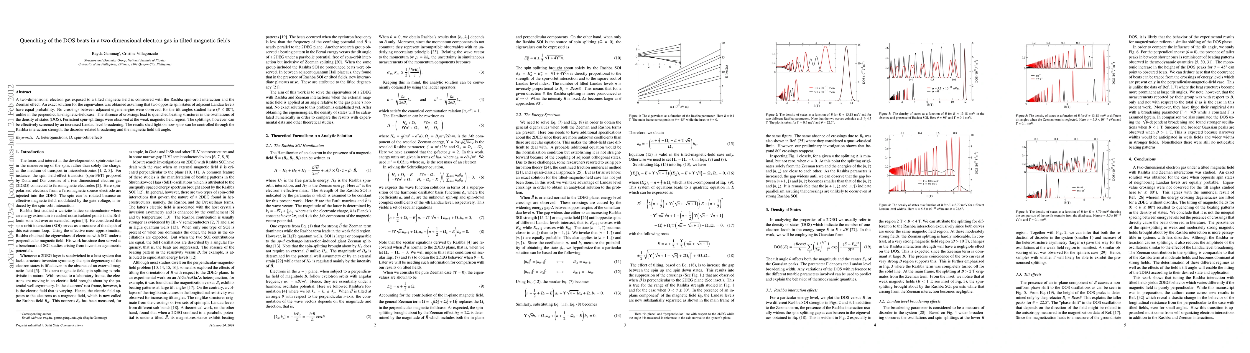 This paper investigates the density of states (DOS) in a two-dimensional electron gas under a tilted magnetic field, revealing that the DOS beats are quenched due to the absence of crossings between adjacent eigenenergies. The study highlights the role of Rashba spin-orbit interaction and magnetic field tilt in controlling spin-splittings and broadening effects.