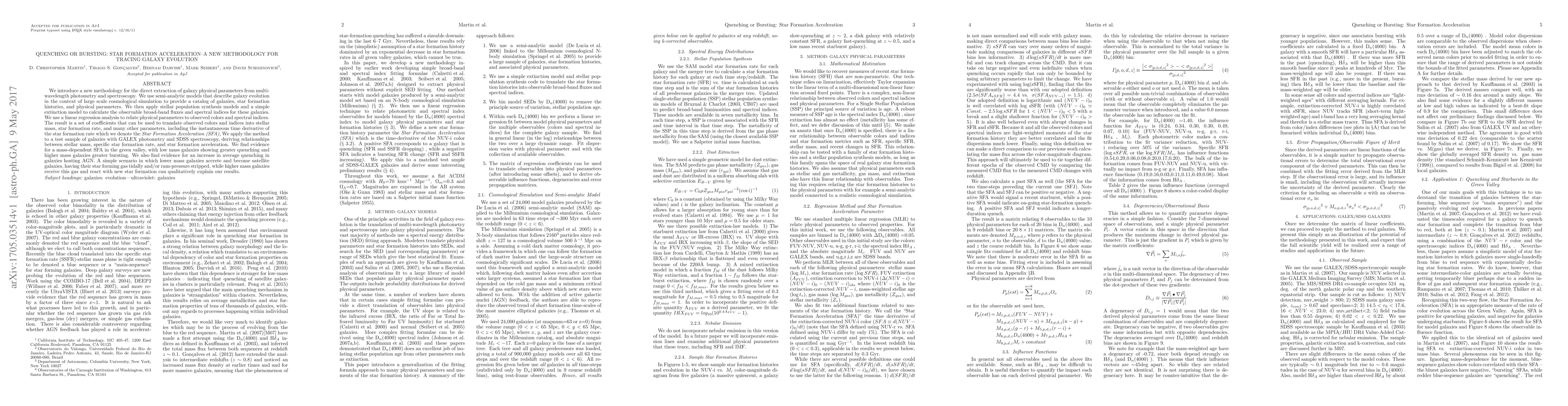 We introduce a new methodology for the direct extraction of galaxy physical parameters from multi-wavelength photometry and spectroscopy. We use semi-analytic models that describe galaxy evolution in the context of large scale cosmological simulation to provide a catalog of galaxies, star formation histories, and physical parameters. We then apply stellar population synthesis models and a simple extinction model to calculate the observable broad-band fluxes and spectral indices for these galaxies. We use a linear regression analysis to relate physical parameters to observed colors and spectral indices. The result is a set of coefficients that can be used to translate observed colors and indices into stellar mass, star formation rate, and many other parameters, including the instantaneous time derivative of the star formation rate which we denote the {\it Star Formation Acceleration (SFA)}, We apply the method to a test sample of galaxies with GALEX photometry and SDSS spectroscopy, deriving relationships between stellar mass, specific star formation rate, and star formation acceleration. We find evidence for a mass-dependent SFA in the green valley, with low mass galaxies showing greater quenching and higher mass galaxies greater bursting. We also find evidence for an increase in average quenching in galaxies hosting AGN. A simple scenario in which lower mass galaxies accrete and become satellite galaxies, having their star forming gas tidally and/or ram-pressure stripped, while higher mass galaxies receive this gas and react with new star formation can qualitatively explain our results.