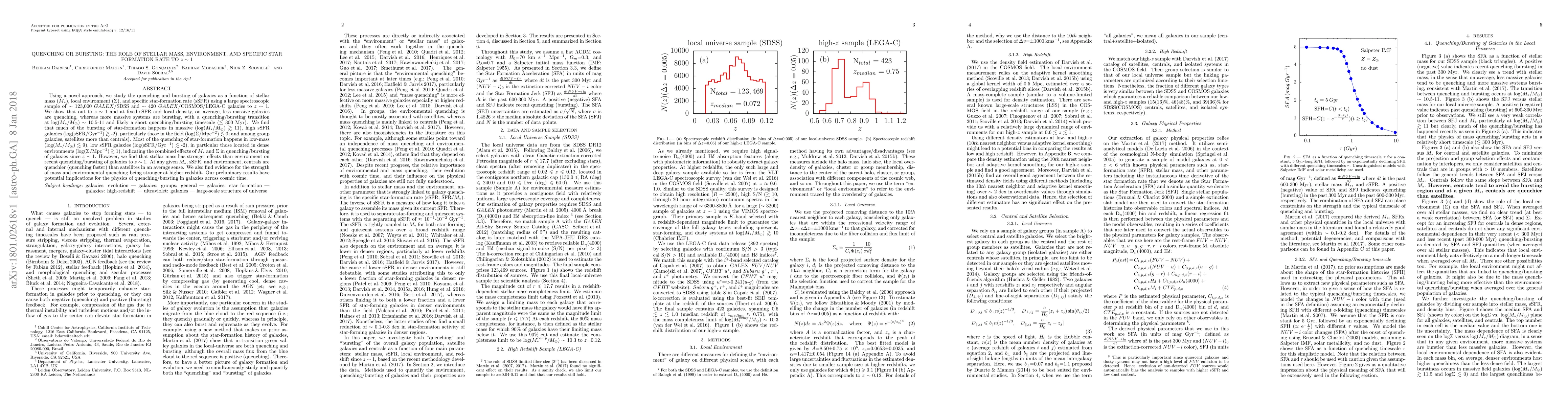 Using a novel approach, we study the quenching and bursting of galaxies as a function of stellar mass ($M_{*}$), local environment ($\Sigma$), and specific star-formation rate (sSFR) using a large spectroscopic sample of $\sim$ 123,000 $GALEX$/SDSS and $\sim$ 420 $GALEX$/COSMOS/LEGA-C galaxies to $z$ $\sim$ 1. We show that out to $z$ $\sim$ 1 and at fixed sSFR and local density, on average, less massive galaxies are quenching, whereas more massive systems are bursting, with a quenching/bursting transition at log($M_{*}$/$M_{\odot}$) $\sim$ 10.5-11 and likely a short quenching/bursting timescale ($\lesssim$ 300 Myr). We find that much of the bursting of star-formation happens in massive (log($M_{*}$/$M_{\odot}$) $\gtrsim$ 11), high sSFR galaxies (log(sSFR/Gyr$^{-1}$) $\gtrsim$ -2), particularly those in the field (log($\Sigma$/Mpc$^{-2}$) $\lesssim$ 0; and among group galaxies, satellites more than centrals). Most of the quenching of star-formation happens in low-mass (log($M_{*}$/$M_{\odot}$) $\lesssim$ 9), low sSFR galaxies (log(sSFR/Gyr$^{-1}$) $\lesssim$ -2), in particular those located in dense environments (log($\Sigma$/Mpc$^{-2}$) $\gtrsim$ 1), indicating the combined effects of $M_{*}$ and $\Sigma$ in quenching/bursting of galaxies since $z$ $\sim$ 1. However, we find that stellar mass has stronger effects than environment on recent quenching/bursting of galaxies to $z$ $\sim$ 1. At any given $M_{*}$, sSFR, and environment, centrals are quenchier (quenching faster) than satellites in an average sense. We also find evidence for the strength of mass and environmental quenching being stronger at higher redshift. Our preliminary results have potential implications for the physics of quenching/bursting in galaxies across cosmic time.