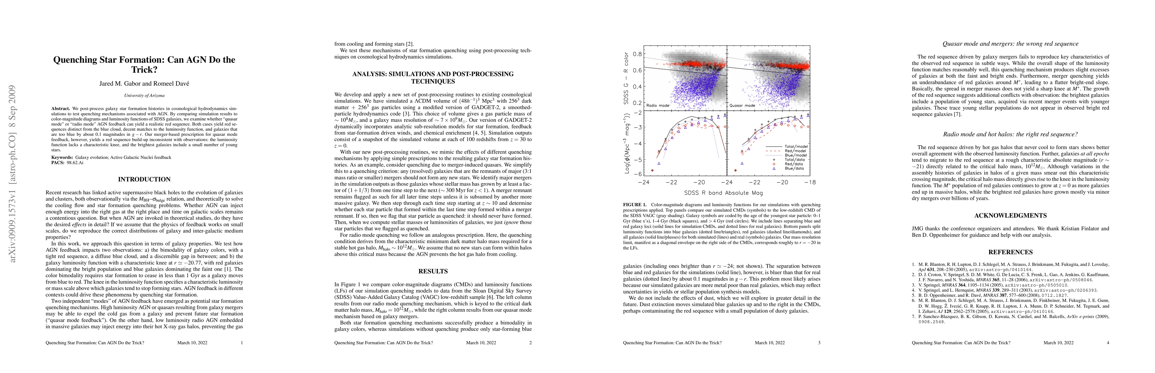 We post-process galaxy star formation histories in cosmological hydrodynamics simulations to test quenching mechanisms associated with AGN. By comparing simulation results to color-magnitude diagrams and luminosity functions of SDSS galaxies, we examine whether "quasar mode" or "radio mode" AGN feedback can yield a realistic red sequence. Both cases yield red sequences distinct from the blue cloud, decent matches to the luminosity function, and galaxies that are too blue by about 0.1 magnitudes in g-r. Our merger-based prescription for quasar mode feedback, however, yields a red sequence build-up inconsistent with observations: the luminosity function lacks a characteristic knee, and the brightest galaxies include a small number of young stars.