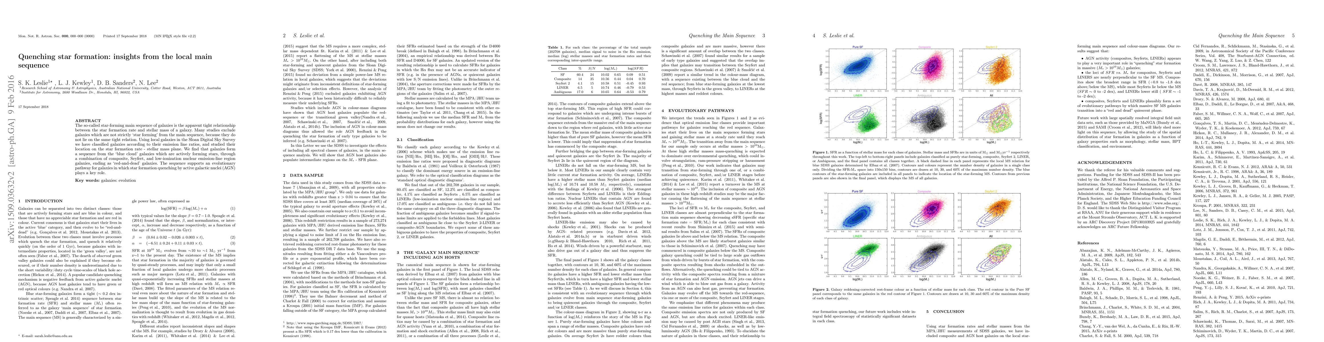 This paper examines the star formation main sequence in local galaxies, revealing an evolutionary sequence from star-forming galaxies to 'red-and-dead' galaxies via composite, Seyfert, and LINER types, suggesting that AGN-driven quenching of star formation is crucial in this transition.