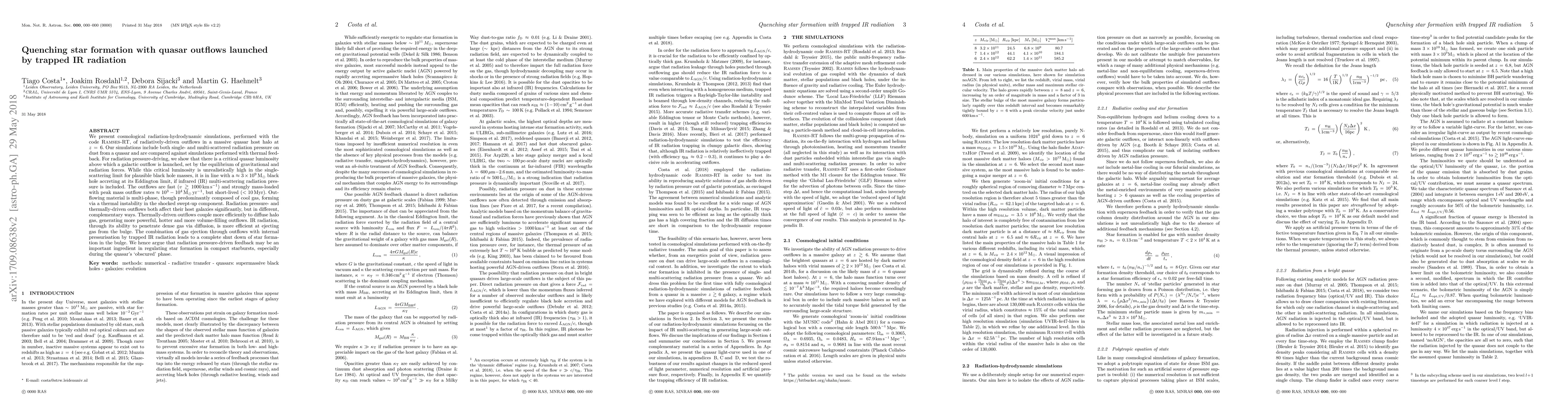 This paper uses cosmological simulations to demonstrate that quasar outflows driven by infrared radiation pressure can quench star formation in massive galaxies at high redshifts. These outflows, launched by multi-scattered IR radiation, are fast and mass-loaded, effectively shutting down star formation in the galactic bulge through gas ejection and internal pressurization.