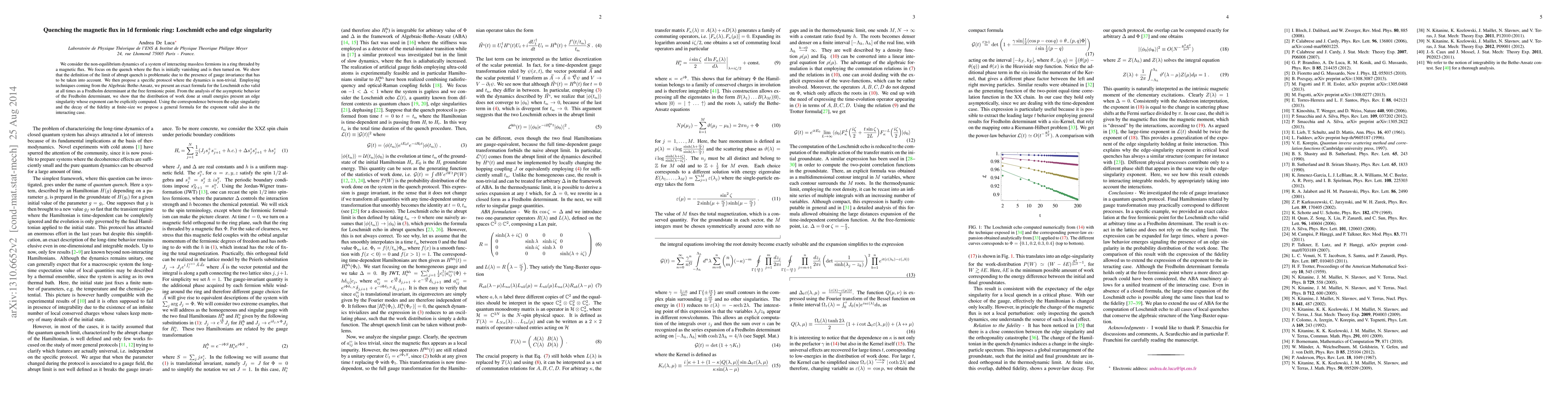 We consider the non-equilibrium dynamics of a system of interacting massless fermions in a ring threaded by a magnetic flux. We focus on the quench where the flux is initially vanishing and is then turned on. We show that the definition of the limit of abrupt quench is problematic due to the presence of gauge invariance that has to be taken into account. We then propose a specific protocol where the dynamics is non-trivial. Employing techniques coming from the Algebraic Bethe-Ansatz, we present an exact formula for the Loschmidt echo valid at all times as a Fredholm determinant at the free fermionic point. From the analysis of the asymptotic behavior of the Fredholm determinant, we show that the distribution of work done at small energies present an edge singularity whose exponent can be explicitly computed. Using the correspondence between the edge singularity and the decay of the fidelity at finite-size we propose a general formula for the exponent valid also in the interacting case.